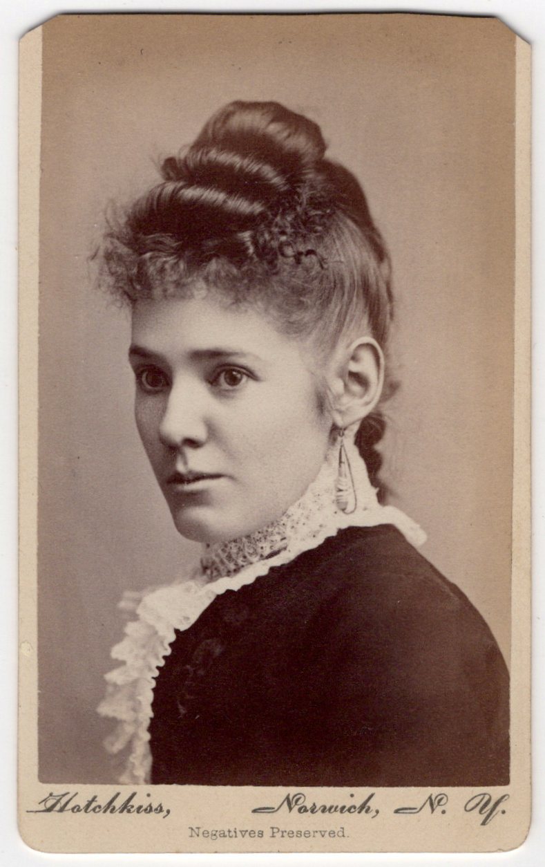 This carte de visite portrait features a pretty young woman. Her hair is stylish and she is well dressed. She is wearing a lace jabot and long earrings. The photographer of this cabinet card is Alston E. Hotchkiss ( c 1846-1907) of Norwich, New York. A. E. Hotchkiss came to Norwich in 1872 at the age of twenty-six. He ran the most popular photo gallery in town and it is reported that he took on the persona of an artistic and cultured gentleman. His wife played a major role in his running the studio, and at one point, he employed at least twenty workers. Note that the top corners of this cdv are trimmed. This carte de visite is in overall good condition (see scans).