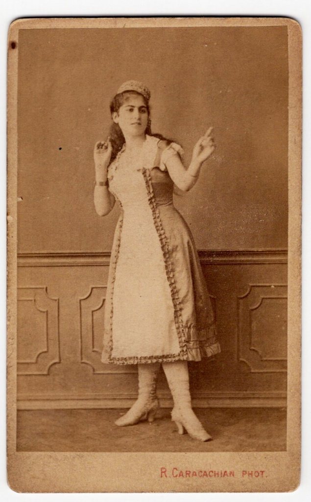 This carte de visite photograph features a young unidentified Turkish actress. She was photographed by Rober Caracachian at his studio in Constantinople, Turkey. SOLD
