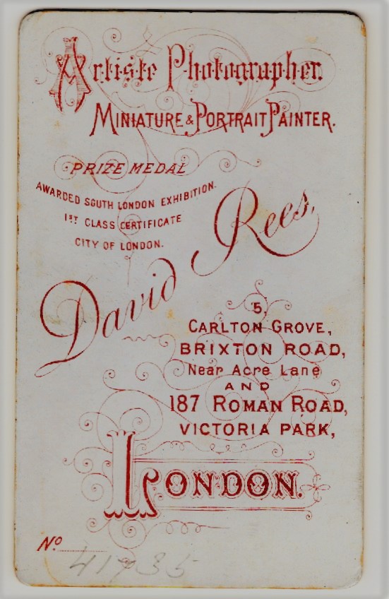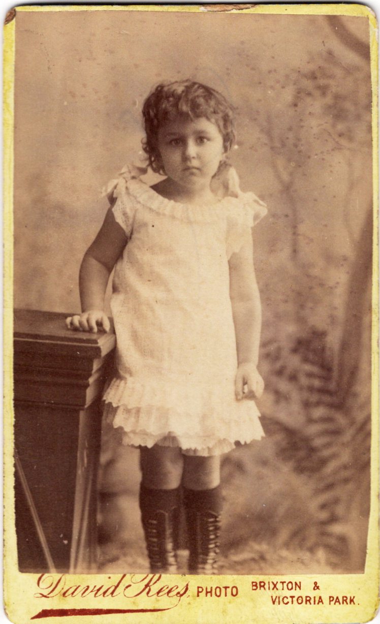 This carte de visite portrait features an adorable little girl. She is looking at the photographer uneasily. The photographer was David Rees and his studio was located in London, England. One of his cdv photographs can be found in Great Britain’s National Portrait Gallery. This cdv has some cornerwear and is in overall good condition (see scans).
