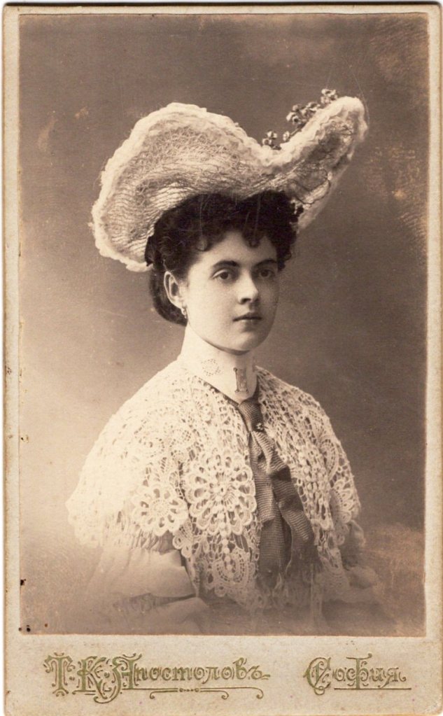 This carte de visite photograph features a delicate pretty young woman posing for her portrait at a Bulgarian photo studio. The woman is quite a fashionista. Note her heart shaped hat, her high collar, and the lace on her dress. (SOLD)