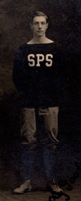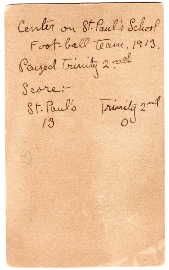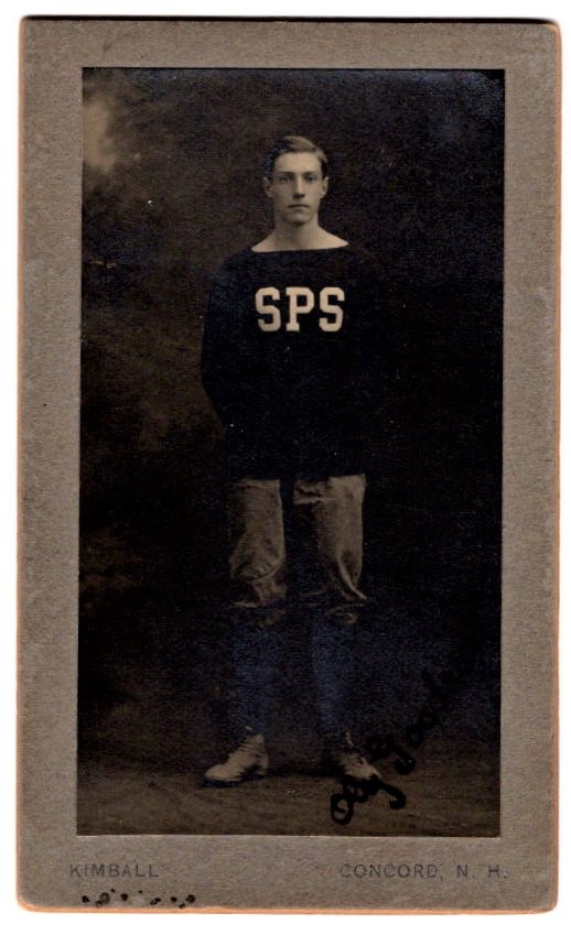 This carte de visite portrait features a football player who played on the 1913 team of St. Paul’s school. The school was located in Concord, New Hampshire.The player is identified on the reverse of the image as “Oly Goodrich”. He was the center of the team. The inscription on the reverse of the image also reports that St. Paul’s beat Trinity with a game score of 13 to 0. This photograph was taken by W.G.C. Kimball (1843-1916) or Howard A. Kimball (1865-1929). In fact the Kimball clan produced several more photographers in the area. The Kimball studio was located in Concord, New Hampshire. This cdv photograph is signed by Oly Goodrich. St. Paul’s School (SPS) is a very selective college prep boarding school. It is considered one of the finest boarding schools in the US. The school was founded in 1856 to educate boys from Upper-class families. It later admitted girls and a more diverse student population. The school exists today and has about 530 students. SOLD