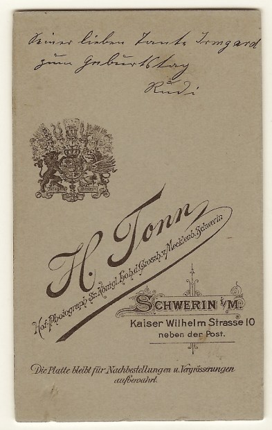 This fantastic carte de visite features an adorable little boy and his toy teddy bear. The toy bear is on a string leash and on four wheels for easy walking. The child’s outfit, including his matching socks, are very stylish. The photograph was taken at the studio of Adolf Bruns in Hamburg, Germany. This larger than usual cdv measures about 2 1/4″ x 4 1/2″ and is in excellent condition.