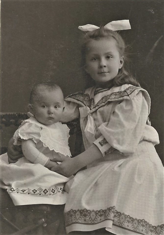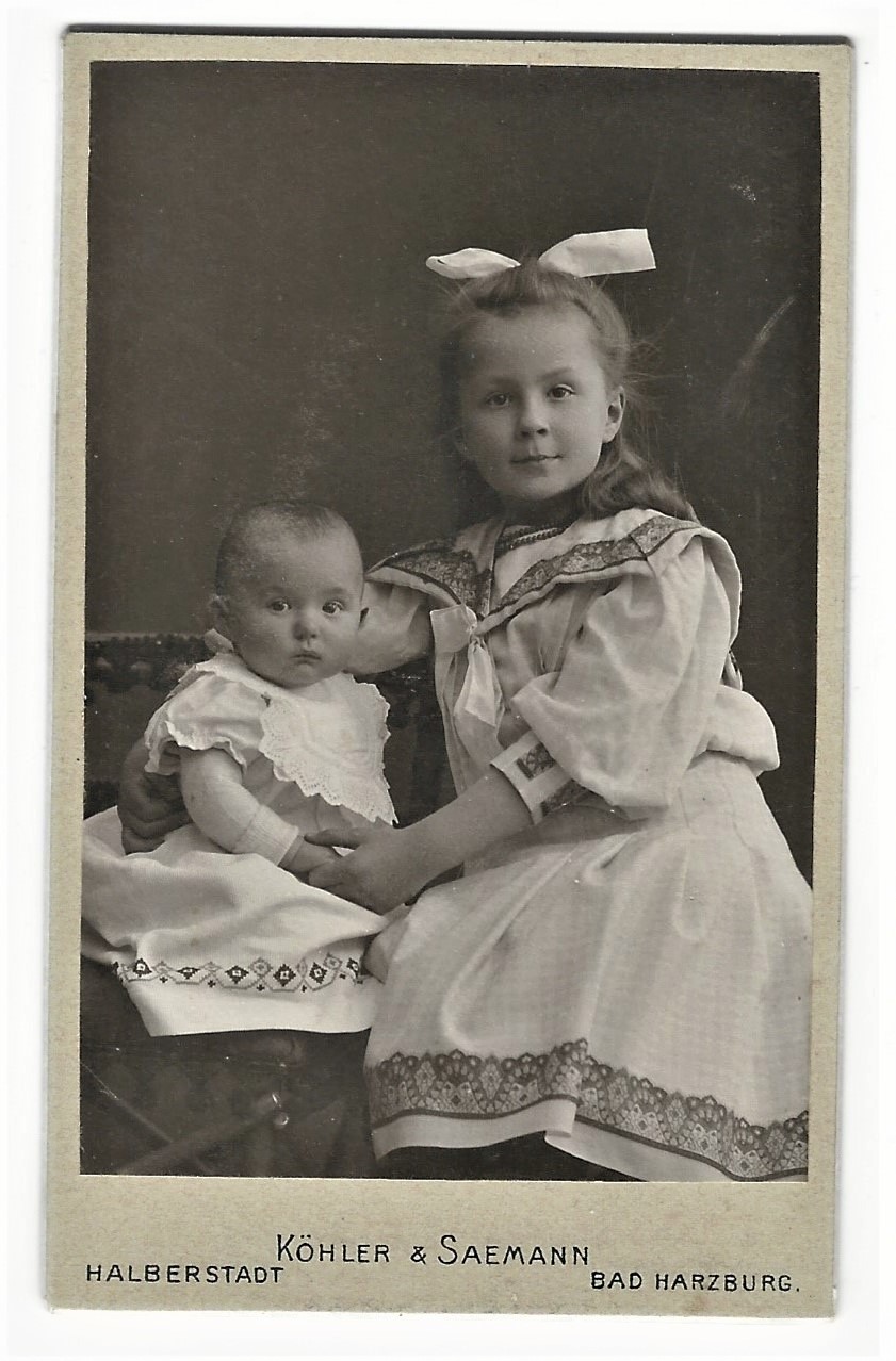 This Carte de Visite (CDV) features a little girl posing next to her infant brother/sister. The little girl is wearing a fancy dress and a bow in her hair. She has a protective hold on her baby sibling. The CDV was photographed by the Kohler & Lacmann studio which had branches in Halberstadt and Bad Harzburg, Germany. (SOLD)