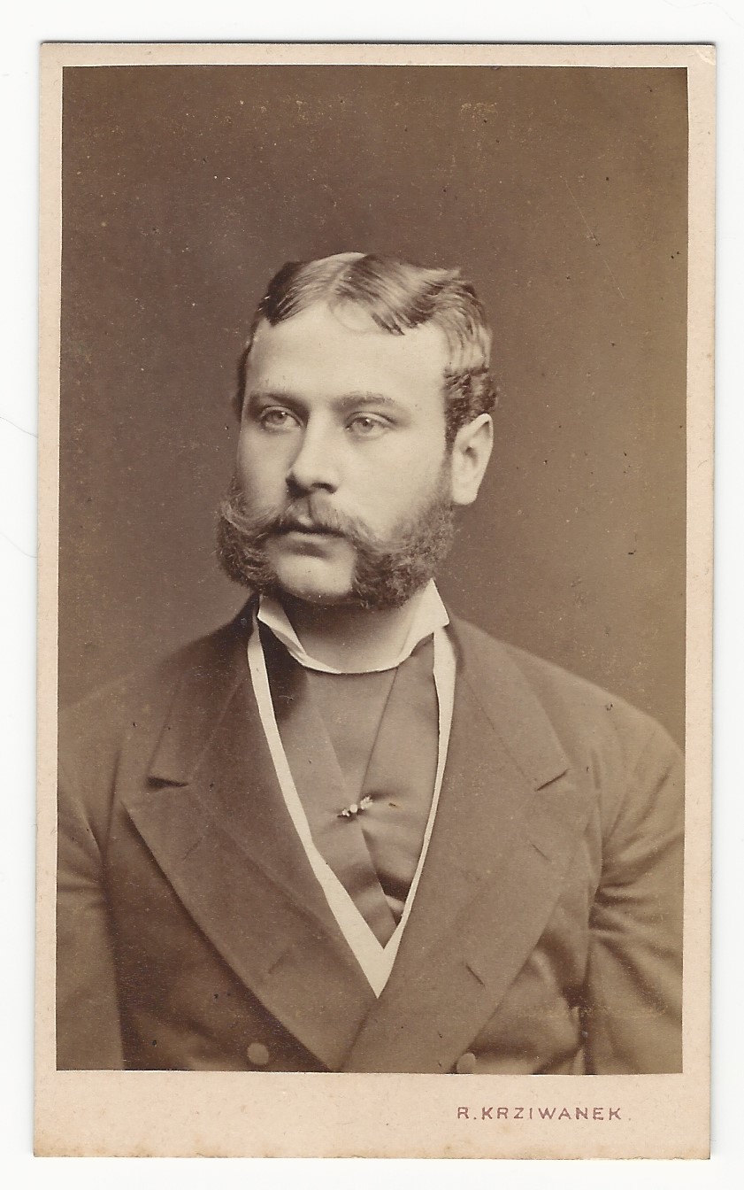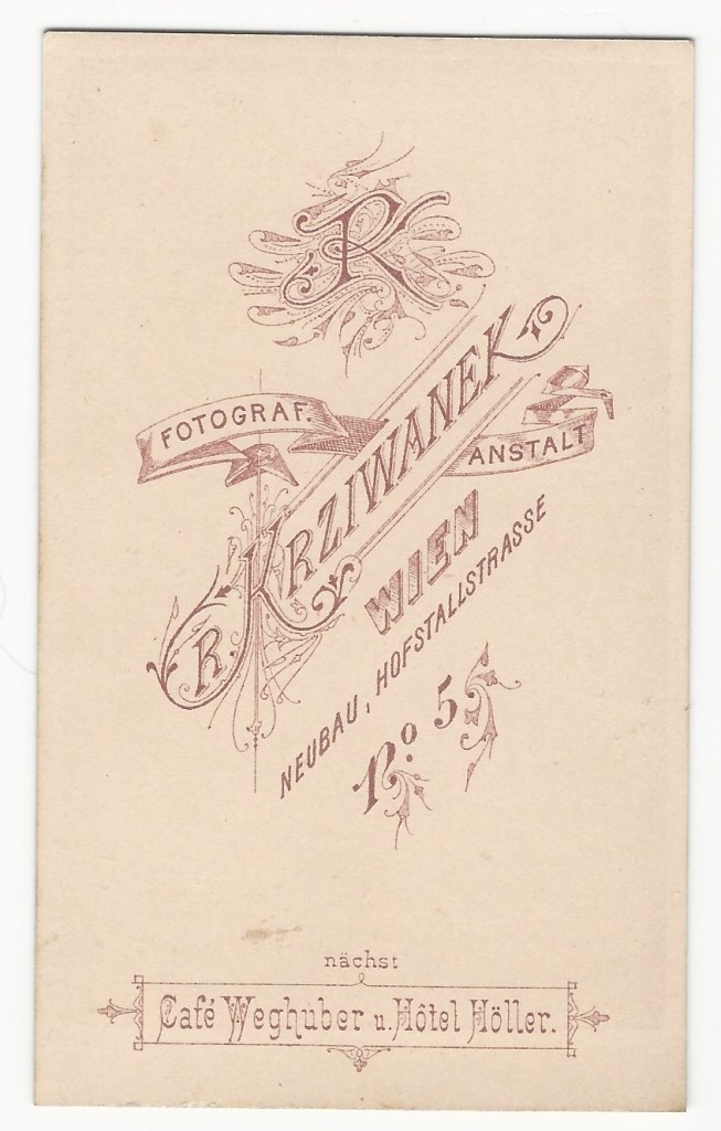 This carte de visite portrait features a handsome well dressed gentleman with a carefully manicured beard and mustache. The photographer of this cdv photo is Rudolf Krziwanek (1843-1905). He operated a photographic studio in Vienna, Austria between 1870 and 1905. He also ran a summer studio in Ischl (Austria) between 1879 and 1900. He took portraits of the Hapsburg Court. His photographs are part of the collections in the J. Paul Getty Museum, the National Portrait Gallery (UK), and the New York Public Library. At this point in time, there are three of Krziwanek’s photos in the Cabinet Card Gallery. Krziwanek was also an inventor. In 1905, he received a patent for a device which was used in an “air gas system”. He committed suicide that same year. Print on the reverse of the photograph states that the studio was next to the Cafe Weghuber, a popular coffeehouse. The establishment was in business between 1806 and 1865. It was founded as Cafe Eichhorn and renamed Cafe Weghuber in about 1840. Later, a park was built in front of the cafe and it became a venue for concerts and large parties. Since the Cafe Weghuber went bankrupt in 1865, it is safe to say that this photo was taken before 1865. This carte de visite photograph has excellent clarity and is in excellent condition (see scans).