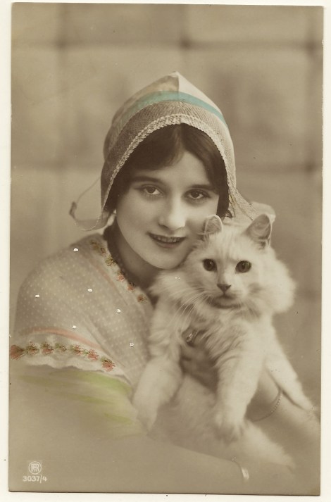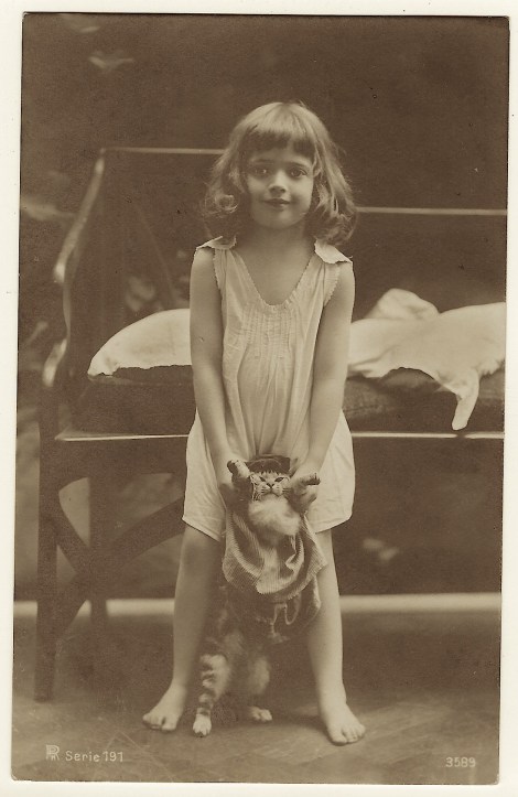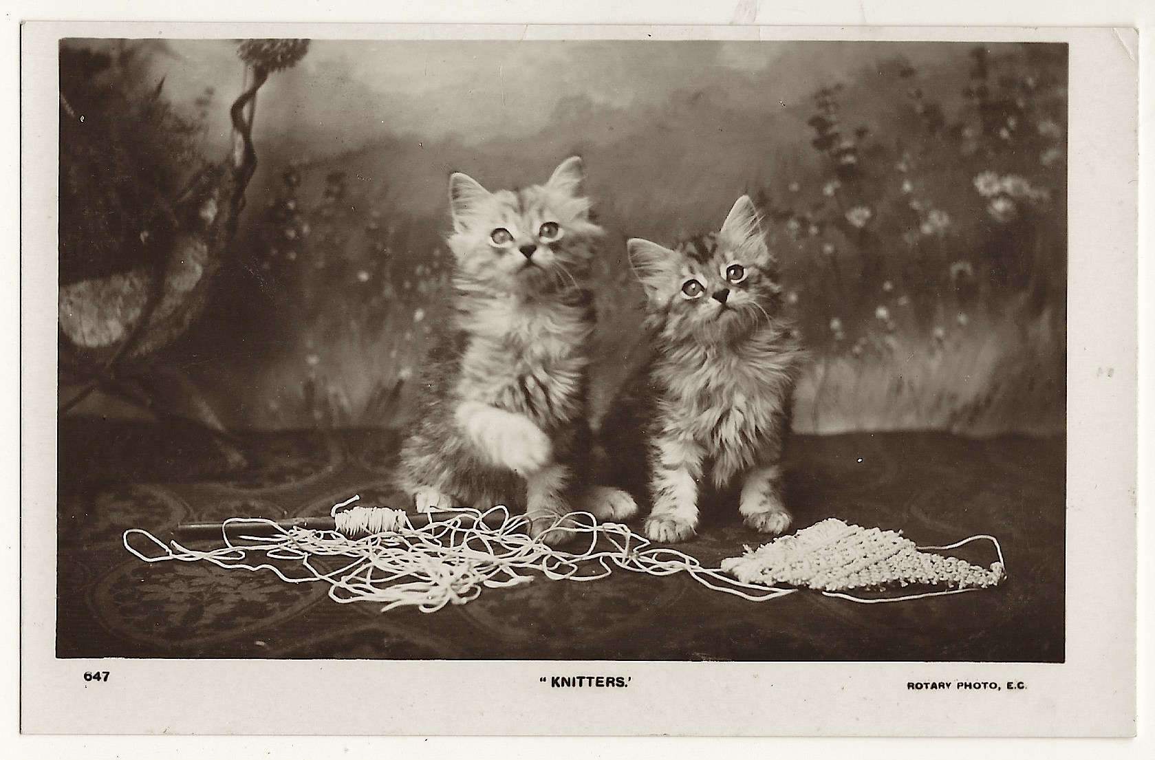 This vintage real photo postcard is captioned “knitters”. This photograph captures two adorable kittens playing with knitting. The postcard was published by Rotary Photo as part of a series (no. 647). The card is from circa 1910’s and is in very good condition.