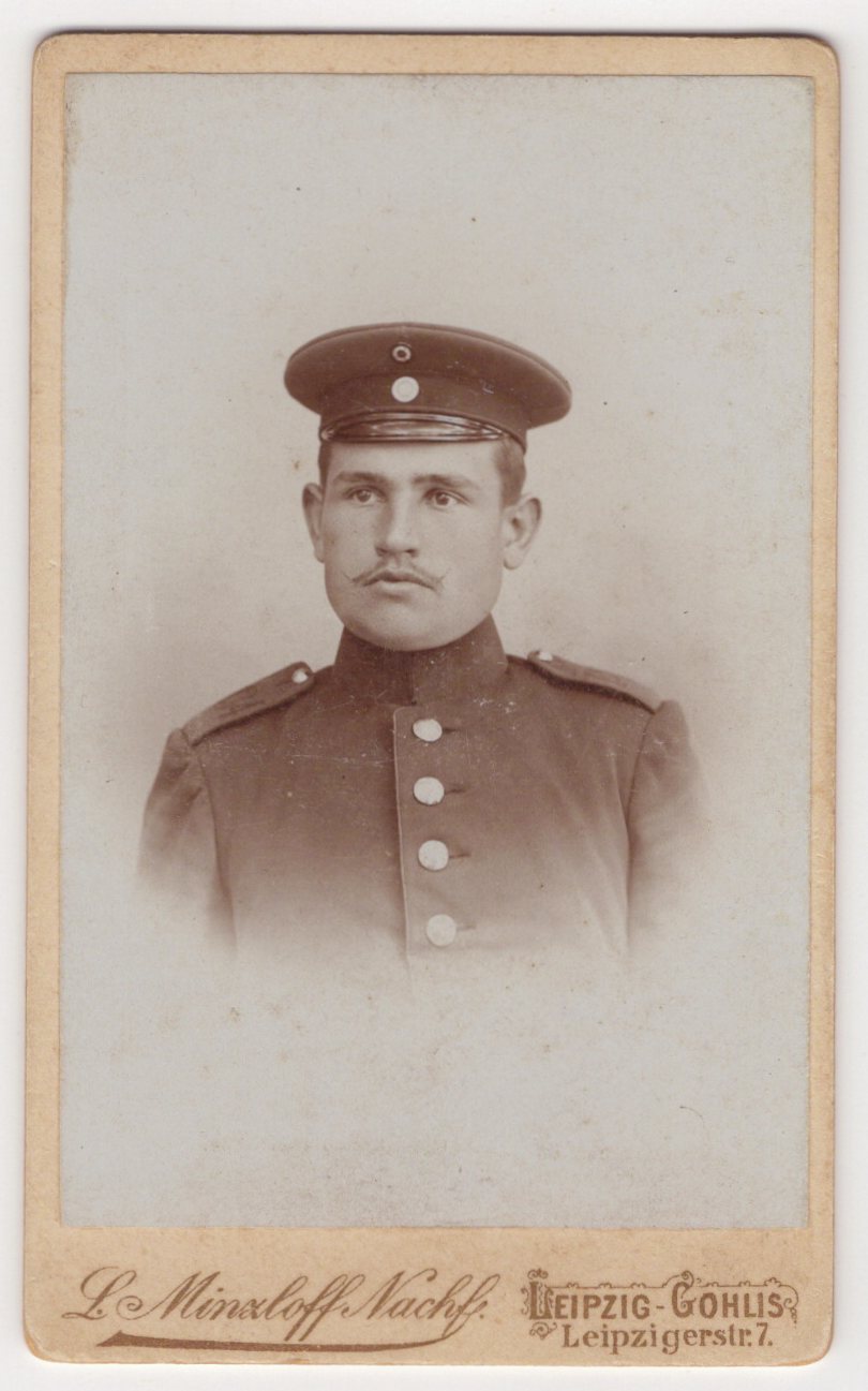 This cartes de visite features a portrait of a handsome young German soldier. He looks sharp in his uniform. The photographer of this image is L. Minzloff and his studio was located in Leipzig-Gohlis, Germany. Gohlis is in the northwest part of Leipzig that was absorbed by Leipzig in 1890. This CDV is in very good condition.