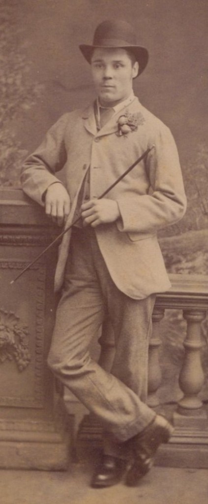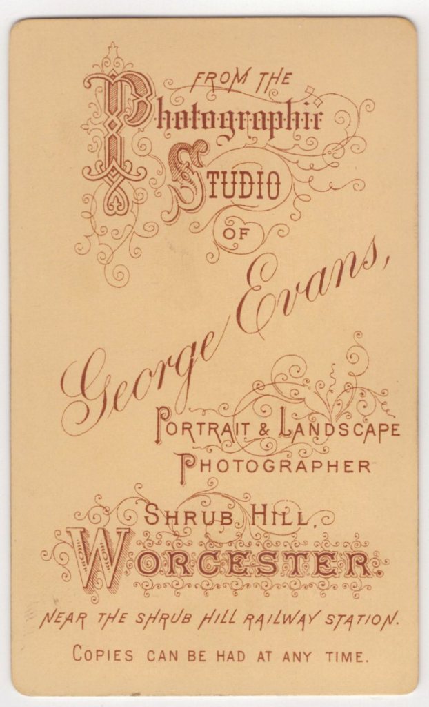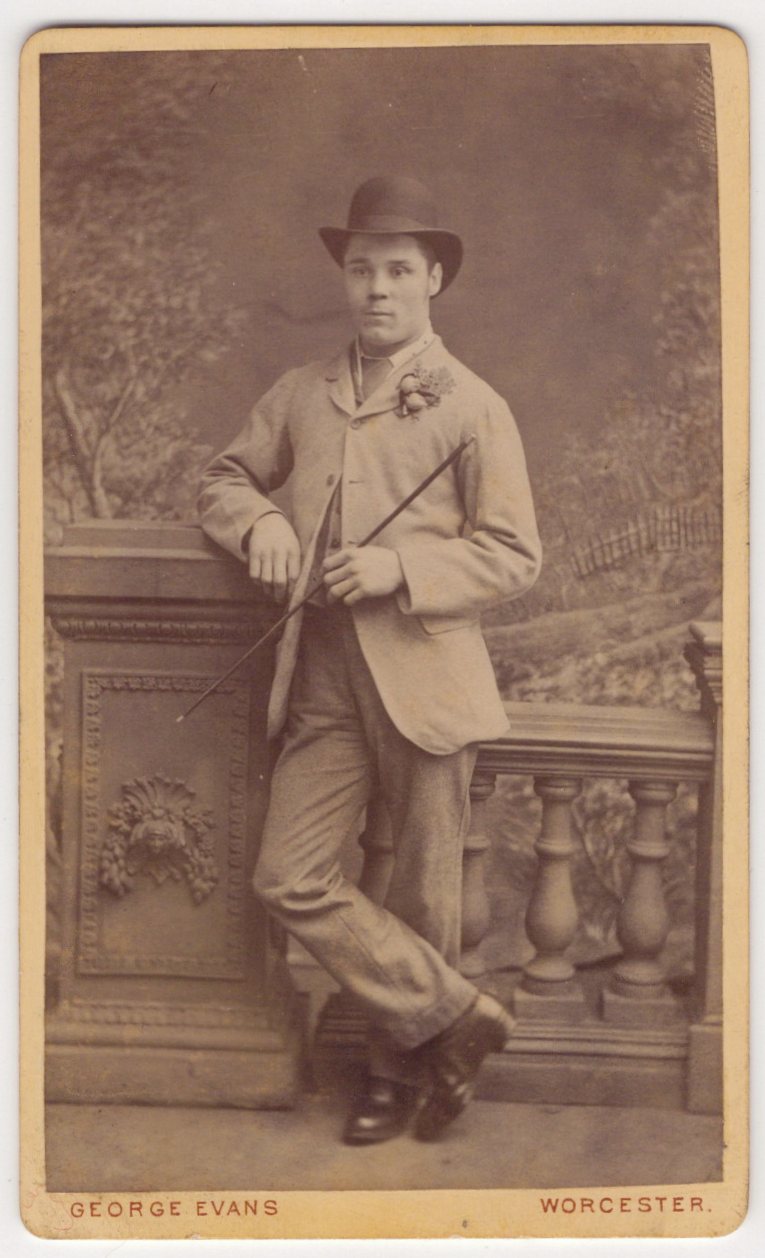This carte de visite features a dapper young man wearing a corsage, derby hat, and a bit of a bewildered expression. Take note of his wand. I call it a wand for lack of a better description. One thinks of wands as being related to magic. However, not all wands are associated with magic. In fact, wands also are symbolic objects of power. The photographer of this cdv image is George Evans who operated a studio in Worcester, England. This cdv is in excellent condition (see scans).