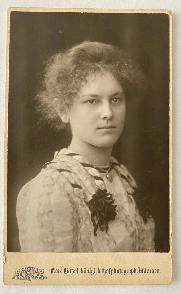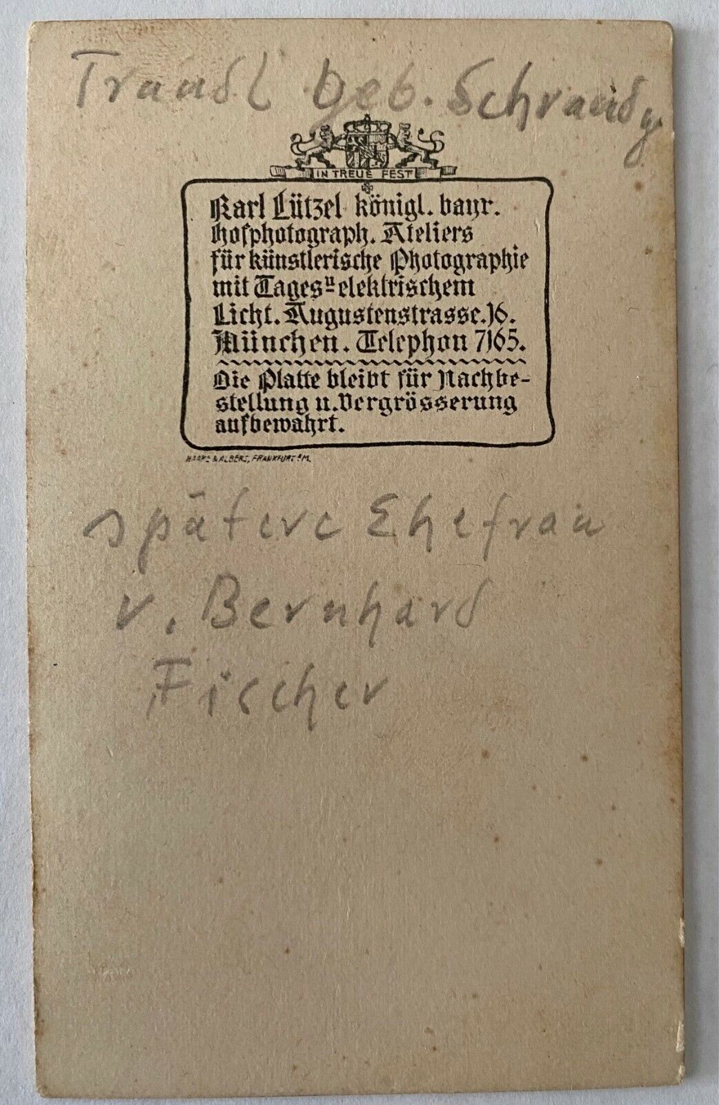 This original carte de visite portrait features a well dressed pretty young woman She was photographed at the studio of renowned photographer, Karl Lutzel. His studio was located in Munich, Germany. There is an inscription on the reverse of the cdv. I had difficulty obtaining a complete translation. I believe that the inscription states that the woman in the photograph is the wife of Bernhard Fischer. It is also my theory that “Schraidy?” was her maiden name. I would appreciate any help with the translation. (SOLD)