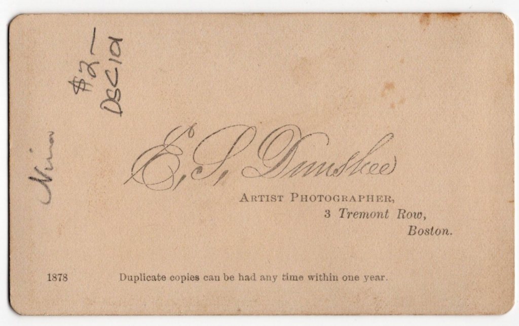 This carte de visite portrait features a pretty young woman. She is wearing a lace collar, earrings, and curls. She is identified by an accompanying note. Her name is “Nellie Smith”.She is posing for her portrait at the studio of E. S. Dunshee in Boston, Massachusetts. Photographer Edward Sidney Dunshee was born 1823 in Bristol, Vermont and died in 1907 in Philadelphia, Pennsylvania. In 1857 he and Cornelius Dunshee (his father) were photographers in Falls River, MA. He produced ambrotypes and daguerrotypes there. He next operated out of New Bedford, MA. One of his New Bedford clients was Henry David Thoreau, who sat for a portrait in 1861. By 1873 he and Thomas Rice Burnham operated as Dunshee and Burnham in Boston, MA. Between 1873 and 1876 he and Edward Byron Dunshee were in business as E. S. Dunshee and Son and located on Tremont Row in Boston, MA. By 1880, Edward Sidney Dunshee had moved to Philadelphia and apparently, after some time, his son took over the business. It appears that E. S. Dunshee had his last studio in Trenton, New Jersey (1894-1901). This cdv is dated 1878. Dunshee’s photography resume is confusing because different sources offer slightly different histories. In addition, the fact that his father and son were photographers, further clouds the accuracy of his biographical material. Clearly some writers have confused and entangled each of the Dunshee’s life story. (SOLD)