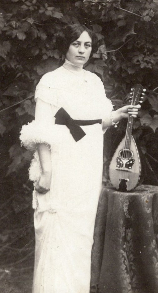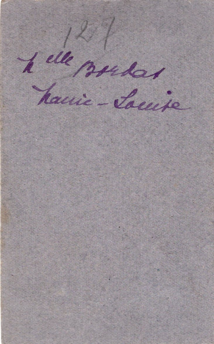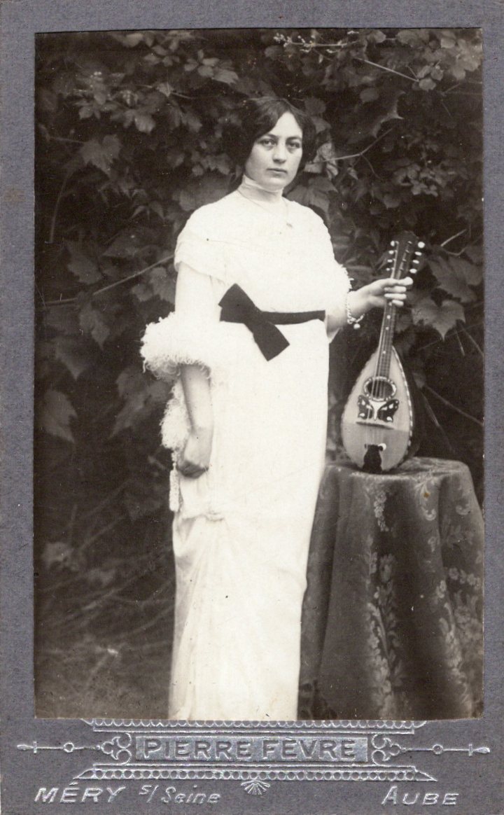This carte de visite portrait features a pretty teenage girl posing with her mandolin. She is dressed in fine fashion. There is an inscription on the reverse of the photo. The inscription appears to be the girl’s name. She was photographed by Pierre Fevre (1880-1914). He operated a studio in Mery, Aube, France. In the 1911 census he is listed as a photographer in Mery. In 1914 he was killed in the Great War (World War I). SOLD