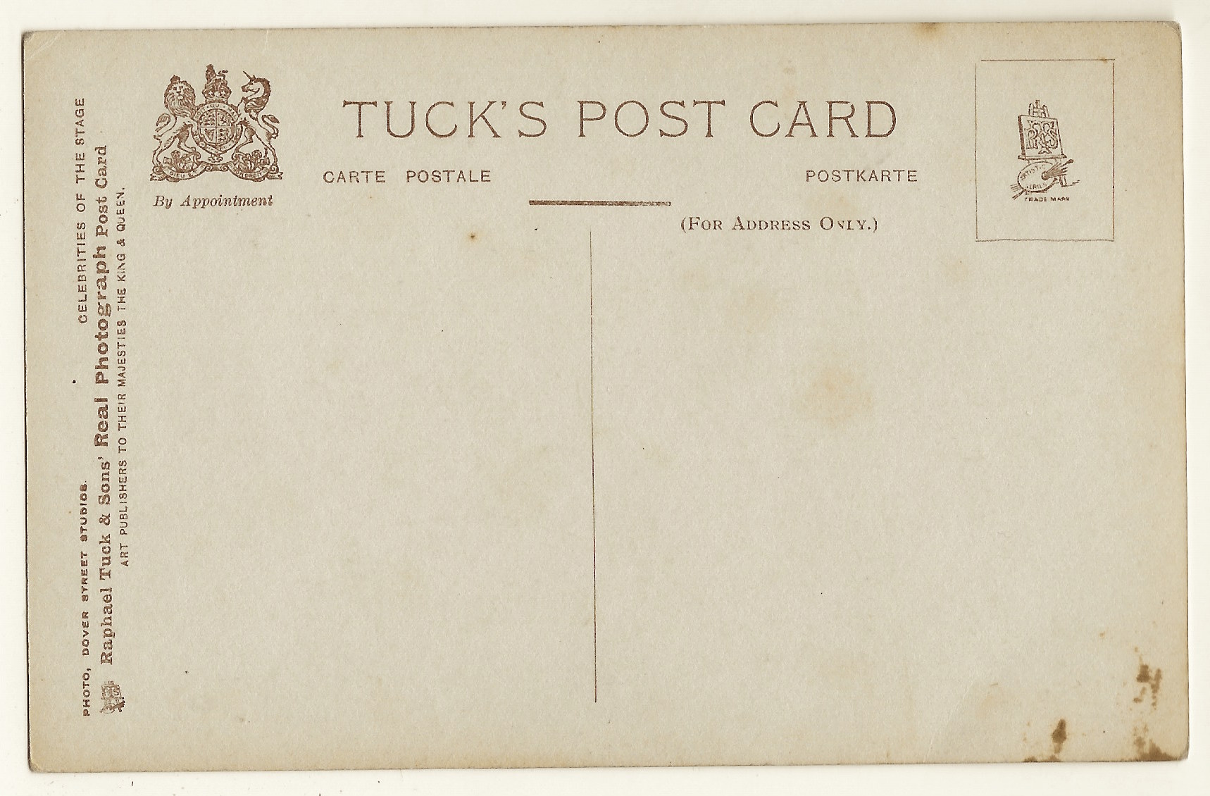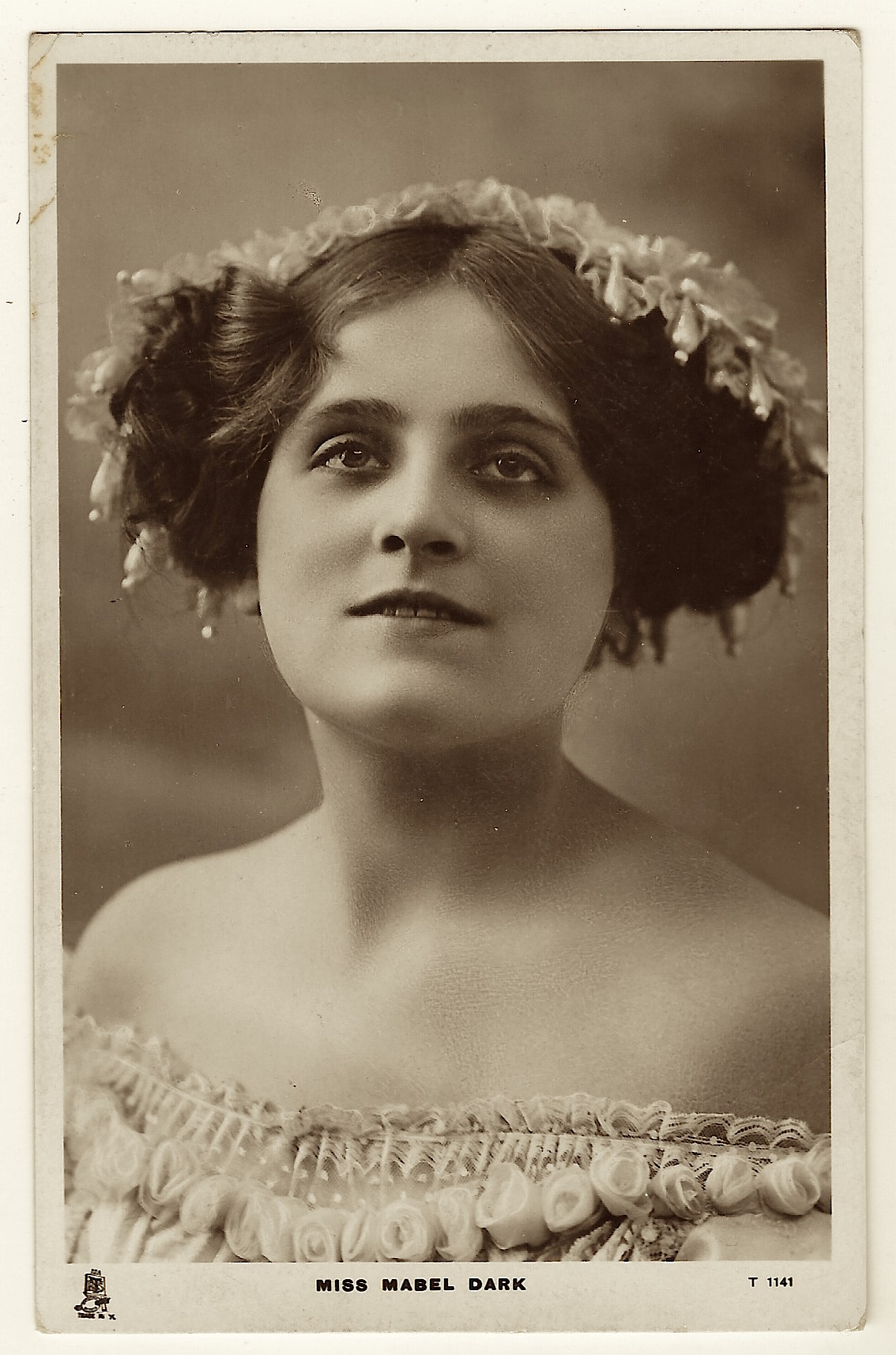 This vintage real photo postcard features stage actress Mabel Dark. She is quite pretty and is wearing a dress exposing her bare shoulders. This image was produced by the Dover Street Studios. The postcard was published by Raphael Tuck & Sons and is part of the “Celebrities of the Stage Series (no. T 1141)”. Raphael Tuck and his wife started their photography business in 1866 in London. Their store sold pictures, greeting cards, and in time, postcards. Their success came from the sale of postcards during the late 1890’s and early 1900’s. In the early 1900’s the firm conducted postcard competitions for collectors of Tuck postcards. These competitions offered cash prizes and they were very popular. The winner of one of these competitions had a collection consisting of over twenty-five thousand cards. Three of Tuck’s four sons participated in the business. The company was devastated by German bombing during World War II. In 1959 the company merged with two other printing companies. SOLD