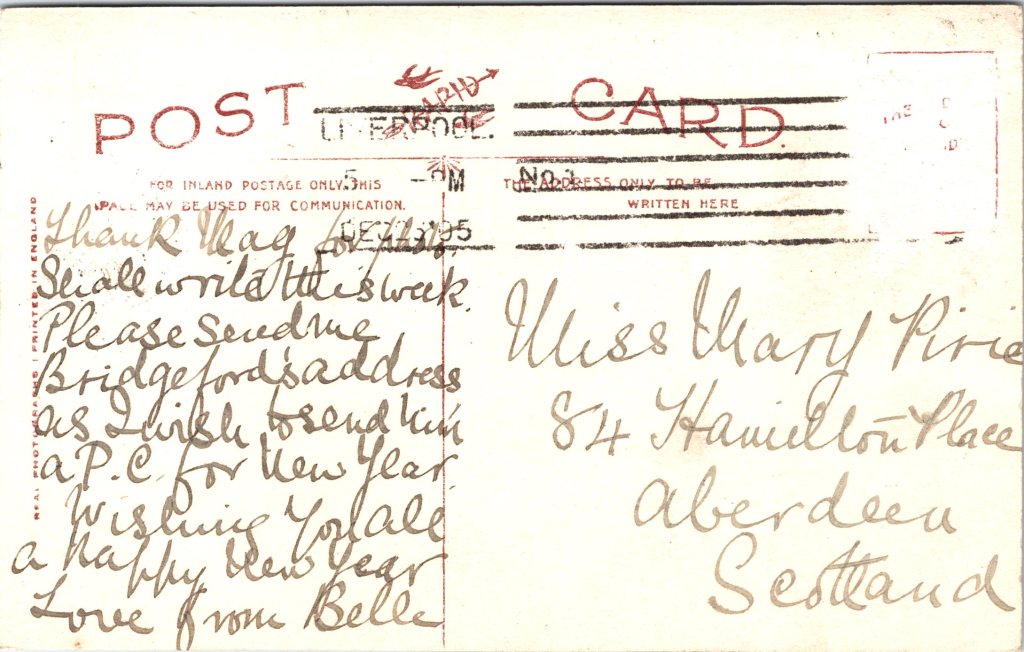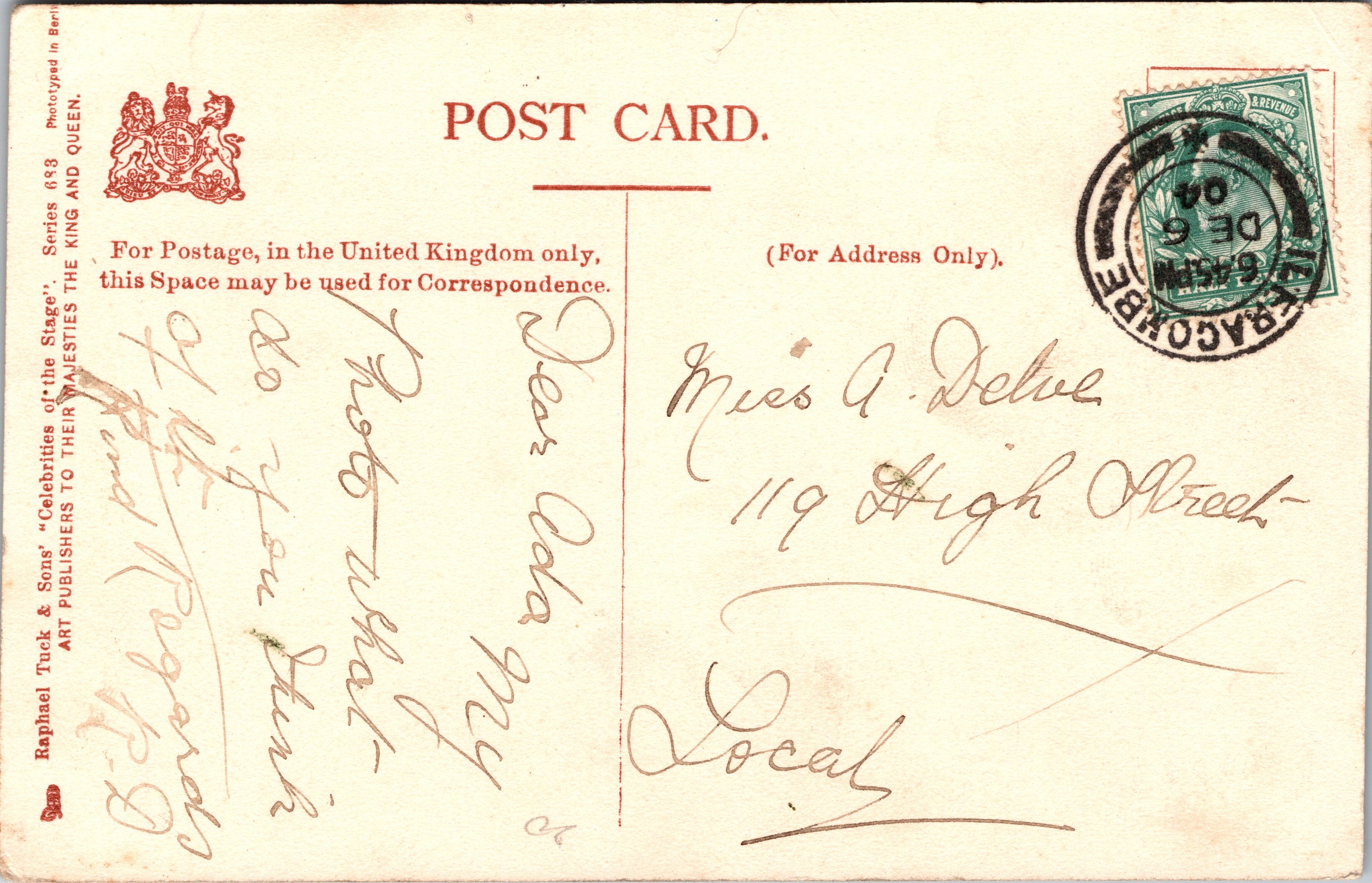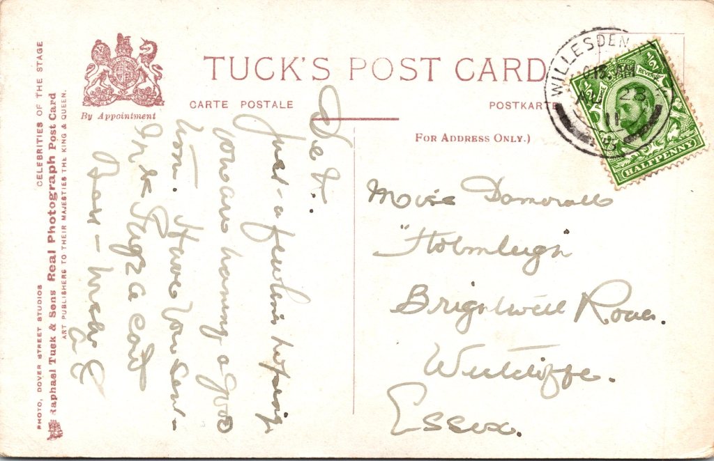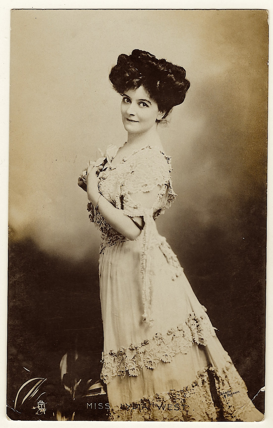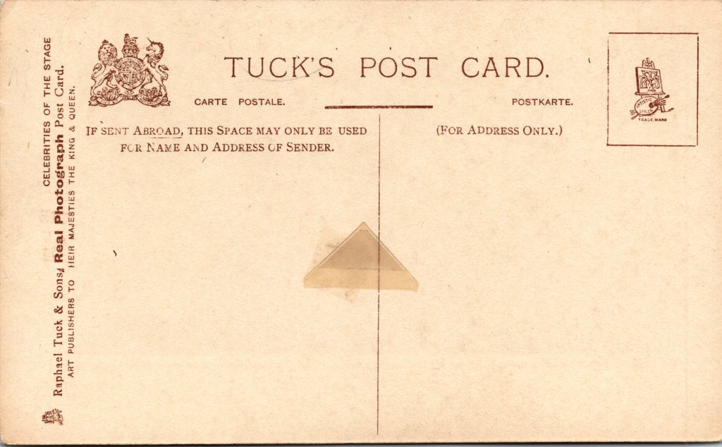 Postcard 2 This postcard was published by Rafael Tuck & Sons. The card was part of the “Celebrities of the Stage” series (683). The photo studio that produced West’s portrait was Biograph Photo. The card is hand colored. The postcard is in good condition (see scans). This postcard’s postmark reveals that the card was mailed in 1904.