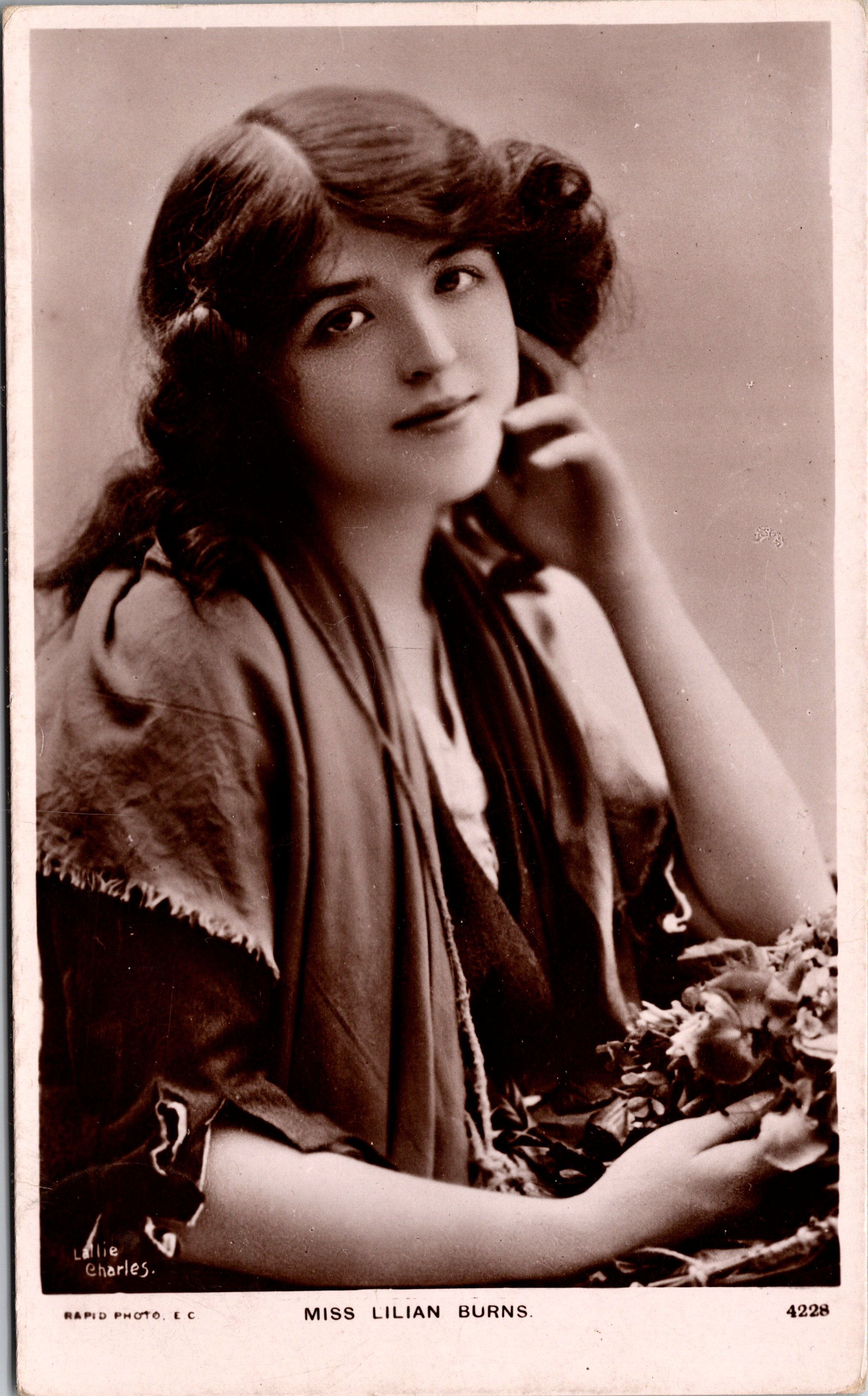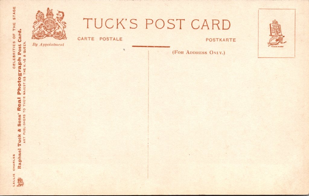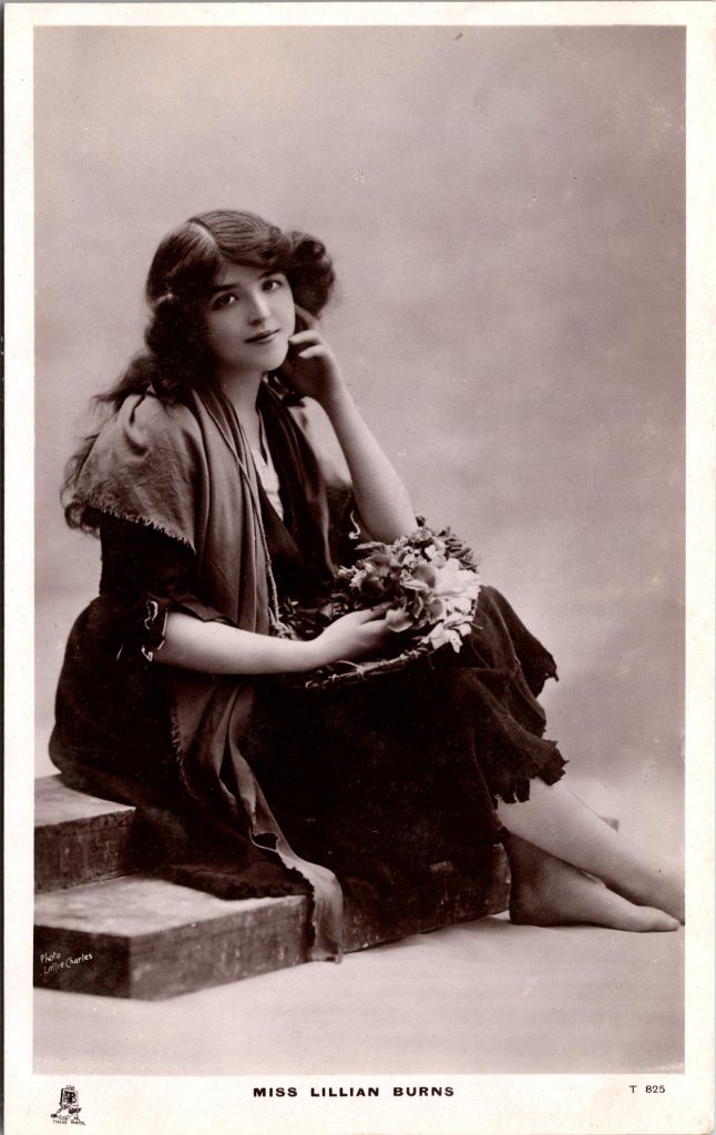 Postcard 1 features pretty film actress Lillian Burns (1903-1998). Burns was an American stage actress hailing from Illinois. She is most known for performing in “A Florida Enchantment” (1914), “The Goddess” (1915), and “The Shop Girl” (1916). She was an acting coach for MGM from 1937 until the early 1960’s. Her filmography includes 41 credits from 1912 through 1916. This photograph was taken by celebrity photographer Lallie Charles (1869-1919). She and her sister, Rita Martin, were the most commercially successful female photographers of their time. The pair were from Ireland. They took photographs of many of celebrities of their era. This photograph was published by Raphael Tuck as part of a series (no.T825). The series was entitled “Celebrities of the Stage”. This postcard is in excellent condition (see scans).
