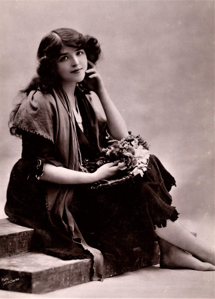 These vintage real photo postcards feature theatre actress, Lydia West. I believe she is British but I am unable to confirm her nationality. In fact, I could find little information about this pretty stage performer. I was able to locate a photograph of Miss West, in costume for her performance in the musical comedy, “Florodoro” (1899). The photo appeared in the theatre magazine, “Play Pictorial”. Research also discovered a Play Program for a play in which West was part of the cast. She played one of twelve butterflies in “My Darling” (1907). The play was co-written by actor, Seymour Hicks, and was produced at the Hicks Theatre. Marie Studholme, a very well known stage actress was in the production.