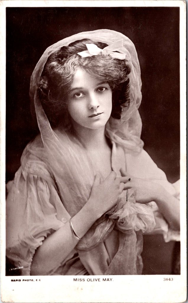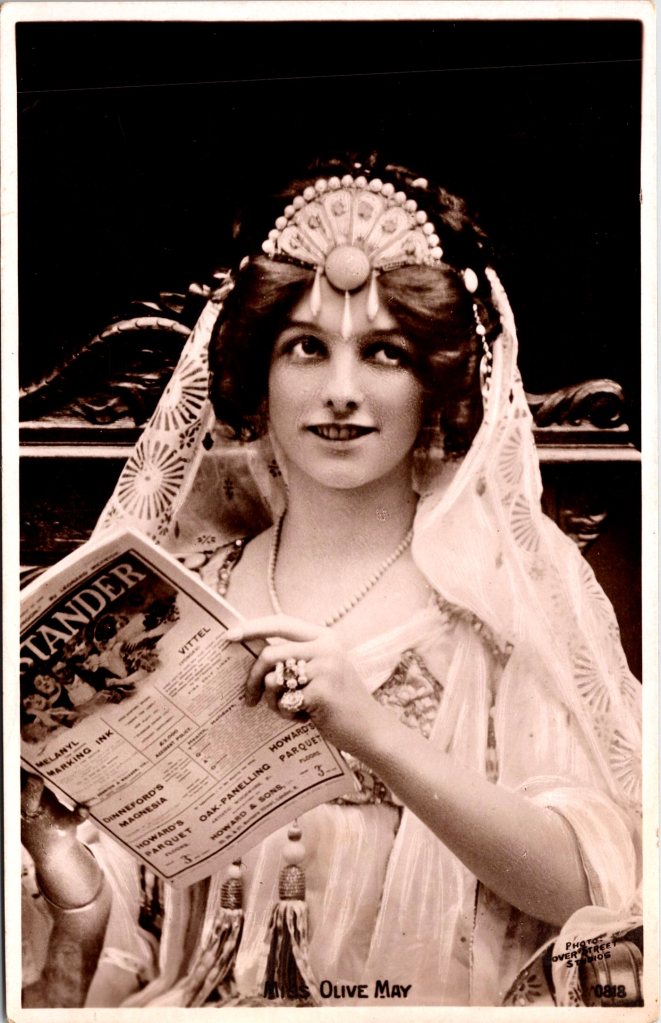 This uncommon vintage real photo postcard, (Postcard 1), features American stage actress, Olive May (1871-1938). She was born in New York City. May made her stage debut in 1893 and quickly became a popular leading lady. She appeared in a number of successful plays, including “Arizona” (1900), “The Merry Widow” (1907), and “The Girl from Utah” (1911). She also was noted for appearing in Maude Adams company and for her Shakespearian roles. The IBDb reports that May appeared in 21 Broadway plays between 1894 and 1928. May was also a popular singer. She was married twice. She had a four year marriage to playwright Henry Guy Carleton and a three year marriage to actor John Albaugh Jr. Widowed at 39 years of age, she never married again. Besides being a talented actress, May was known for her beauty. Many consider her to be one of the prettiest of the real photo postcard actresses of her time. Her beauty is evident in this postcard. She appears to be in costume for one of her theatrical roles. Note her intricate headdress. She is posing with a a copy of “The Bystander” magazine. The magazine began publication in 1903 and covered topics such as theater and literay news, politics, and sports. The magazine also included short stories and cartoons. In 1940 the magazine merged with “The Tatler”. This postcard was published by Rotophot and printed in Germany. Also listed as a publisher was Giesen Brothers & Co. (London). The photograph of Olive May seen on this card was taken by Dover Street Studios. (SOLD)