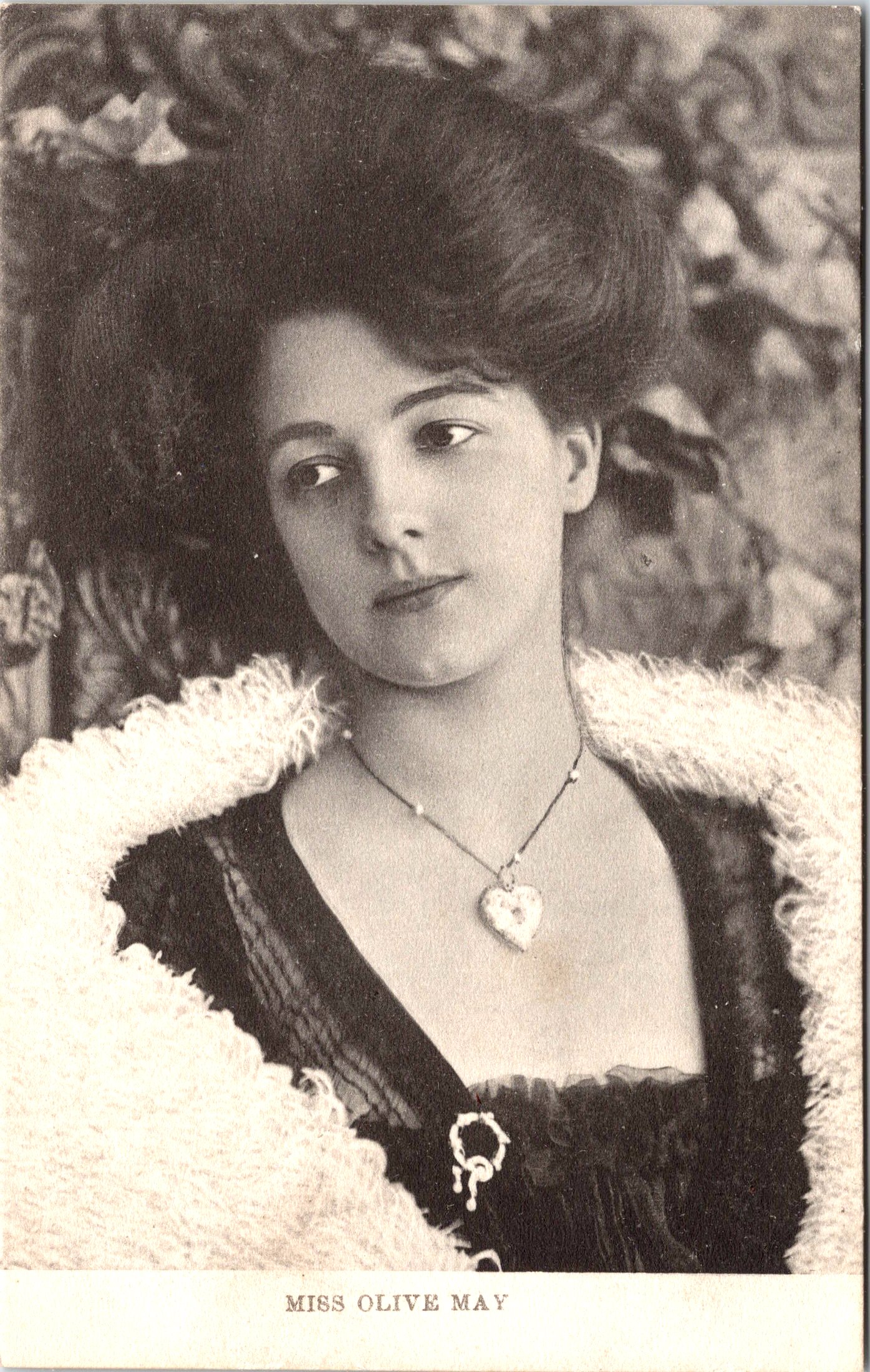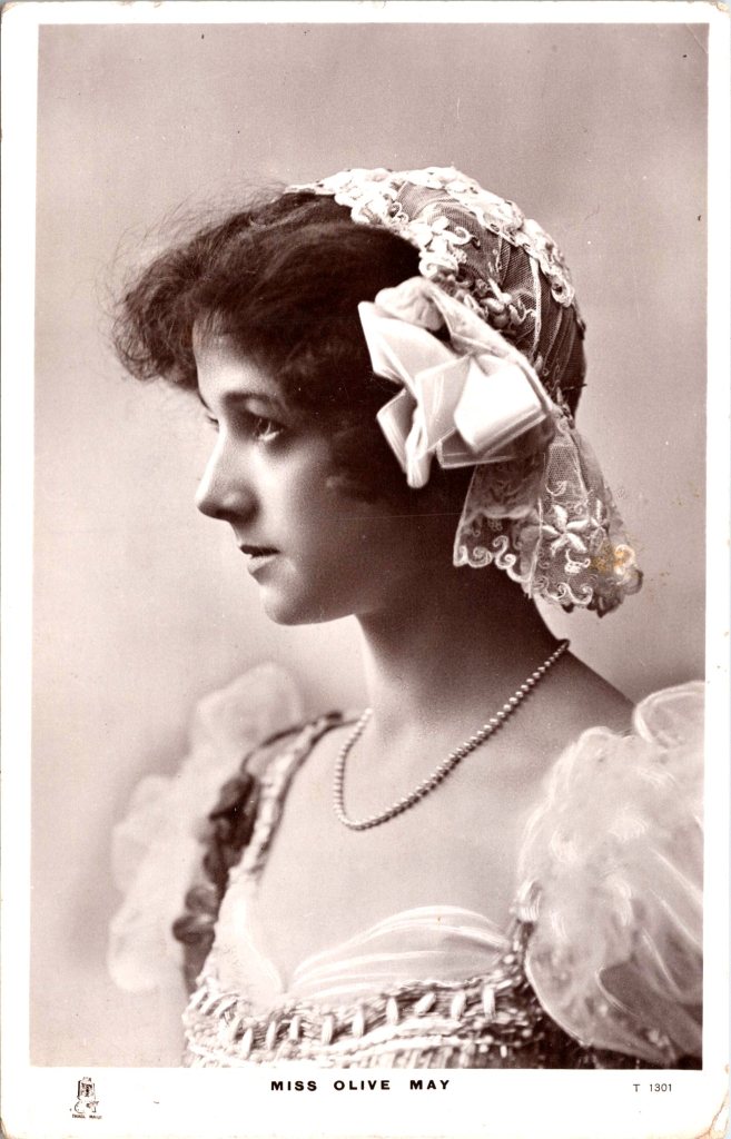 Postcard 3 displays the beauty of Olive May. The photograph on this card captures her in costume for one of her theatrical roles. Note her long white gloves. This postcard was published by Raphael Tuck (No.1727S) as part of the “Celebrities of the Stage” series. It was printed in Great Britain. (SOLD)