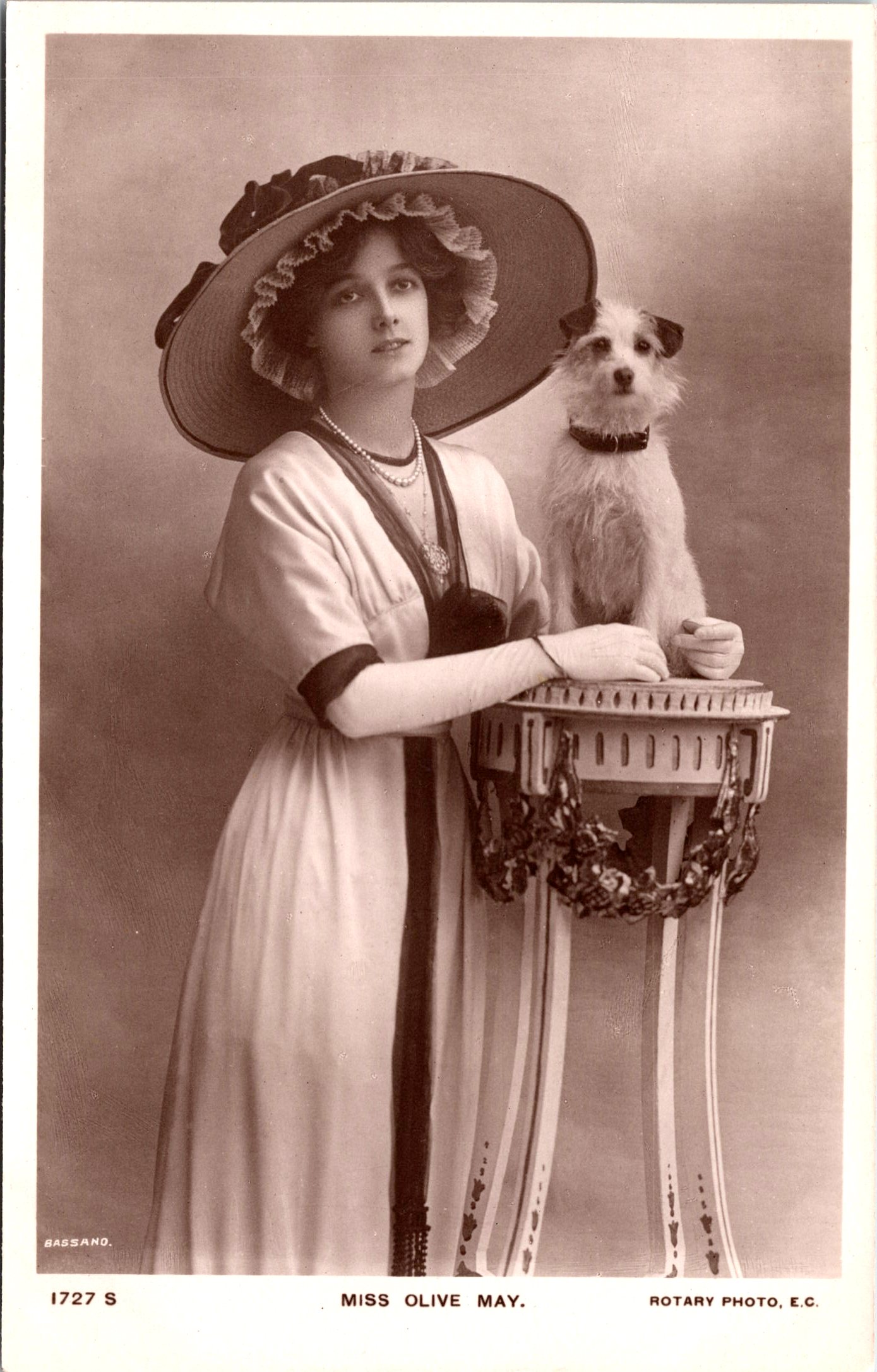 Postcard 5 features Miss May possibly in costume for one of her theatrical roles. Note her long white gloves. Co-starring in this photograph is an adorable little terrier. The dog is sitting on a high stand and Miss May protectively has her hands lightly wrapped around it. The actress was photographed for this card by the esteemed photographer, Alexander Basssano. This postcard was published by Rotary Photo (No.1727S) and was printed in Great Britain. (SOLD)