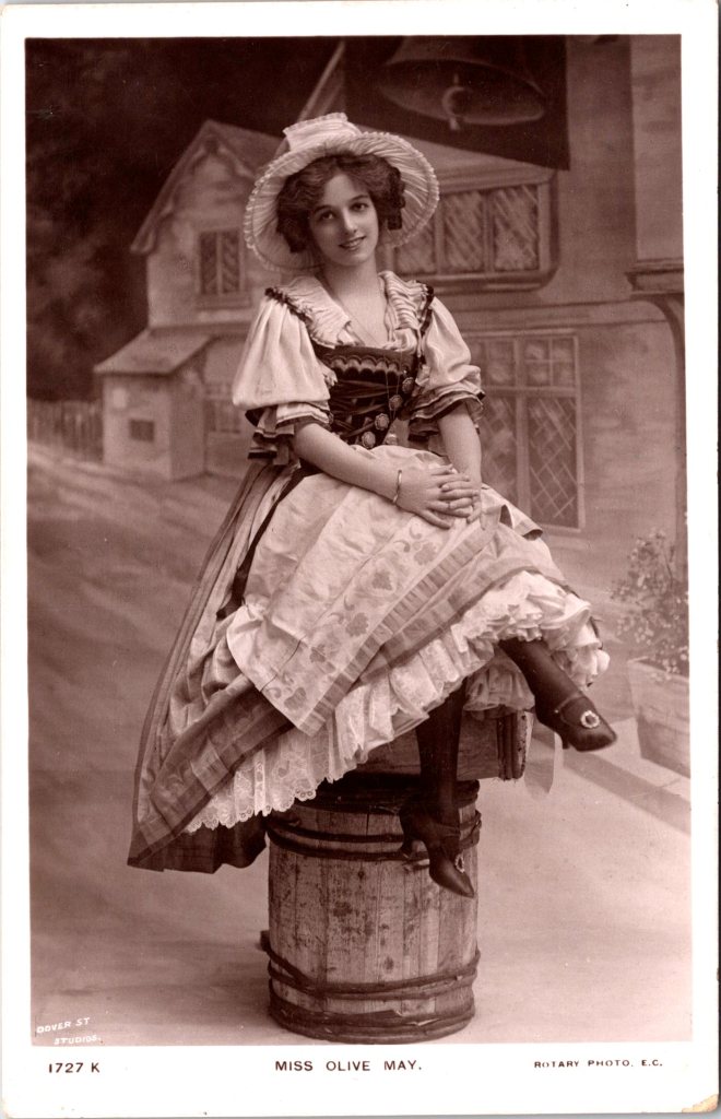 Postcard 6 features May in costume for one of her theatrical roles. Note her pretty lacey dress and hat. Miss May’s pose is atypical. She is sitting on a barrel/table. She has a wonderful smile. This postcard was published by Rotary Photo as part of a series (No.1727K). It was printed in Great Britain. Olive May’s photograph was taken by Dover Street Studios. (SOLD)