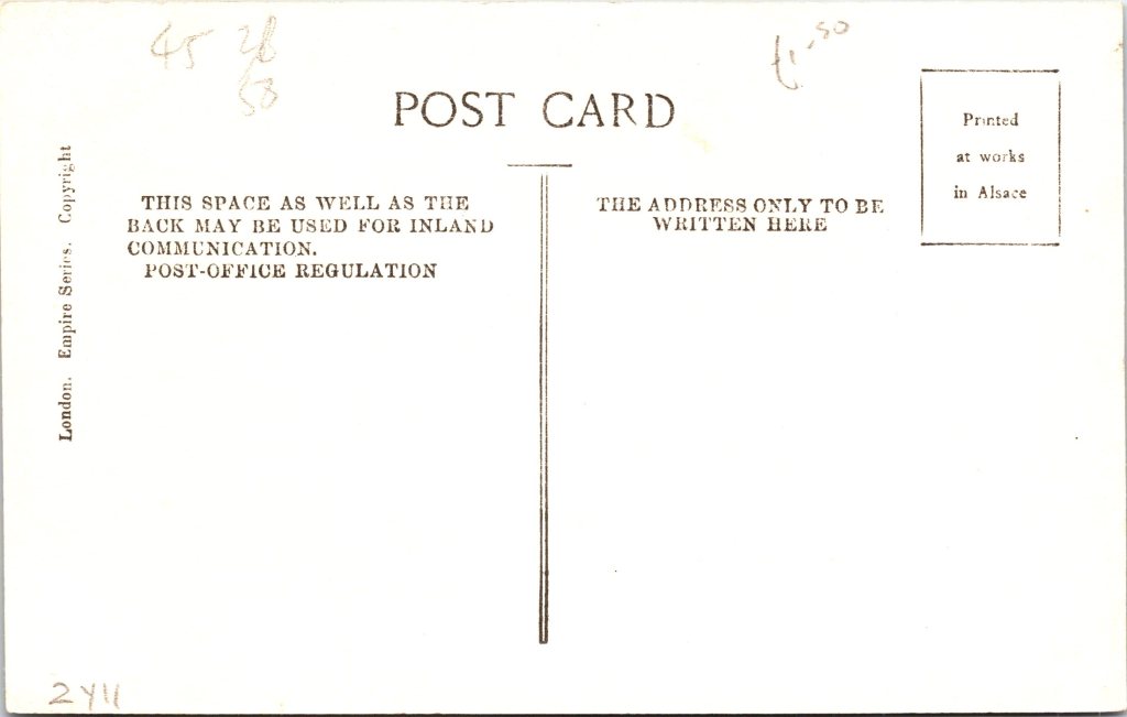 This rare vintage real photo postcard features stage actress, Madge Hodgkinson. There is not much information about her readily available. She sat for one photograph that can be found in the collection of England’s National Portrait Gallery. The photograph was taken by female celebrity photographer, Rita Martin. An article in Royal Magazine (1908) includes another photo to Hodgkinson by Rita Martin. The caption describes her as “a pretty Gibson Girl” and that “Gibson Girls are always delightful”. It is written that Hodgkinson was one of many actresses recently marrying for wealth and/or title. The writer whimsically asks “At this rate, how long will the supply hold out”. Hodgkinson’s groom was Paul Grisewood, “a stock exchange man”. Further research is needed to illuminate details of the pretty actress’s life. This postcard was published by Raphael Tuck & Sons as part of the “Celebrities of the Stage” series (1002). The postcard has a Canadian stamp and a 1914 postmark from Hamilton, Ontario, Canada. SOLD