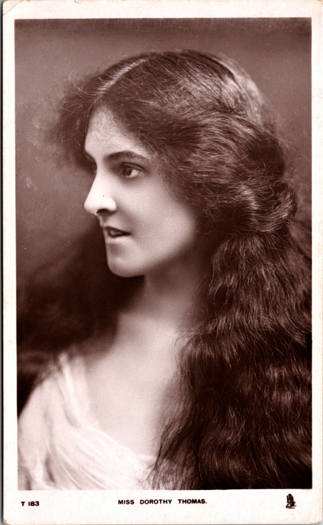This vintage real photo postcard features stage actress, Dorothy Thomas (1882-?). She sat for five photographs in the collection of England’s National Portrait Gallery. She appeared in “The Prisoner of the Bastille” in 1909. Further research is needed to illuminate details of the pretty actress’s life. This postcard was published by Raphael Tuck & Sons as part of the “Celebrities of the Stage” series (T183).This portrait postcard is in overall good condition. Note the album hinge on the reverse of the card.