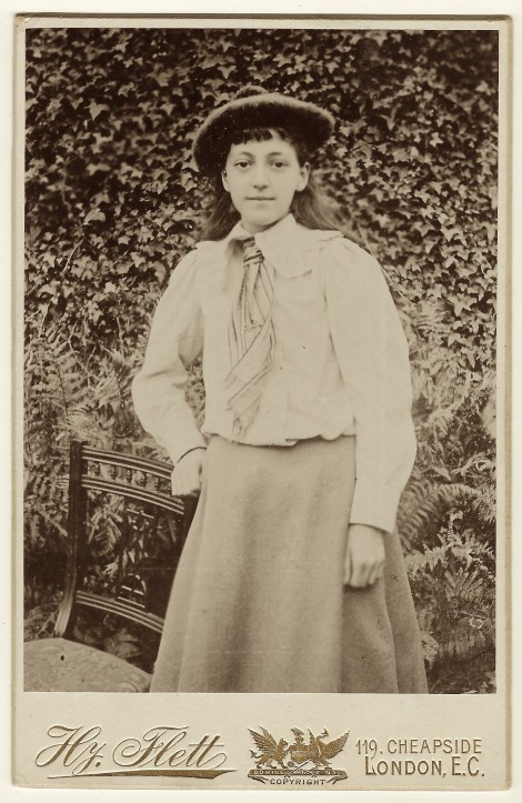 This cabinet card portrait features a sweet looking teenage girl dressed in what today we might call, a “preppy look”. Perhaps she is a student. Be sure to note her scarf and hat. The girl’s eyes are wide open and she appears to be suppressing a smile. The photographer’s camera captured the girl in an outdoor setting. The photographer was Hy. Flett who operated a studio in London. Interestingly, the studio was located at 119 Cheapside. This image is actually the second cabinet card in the “Cabinet Card Gallery” from a studio on Cheapside. Research revealed that Cheapside is the name of a street in the city of London. The name Cheapside is derived from the term “marketplace”. Henry Flett (1872-1948) was born in St. Leonards in Sussex. He operated two London studios. The Cheapside studio existed between 1897 and 1940. His second studio was located at 103 Newgate Street (1903-1909). He partnered with Arthur Frame Stevens in the 1930’s. SOLD