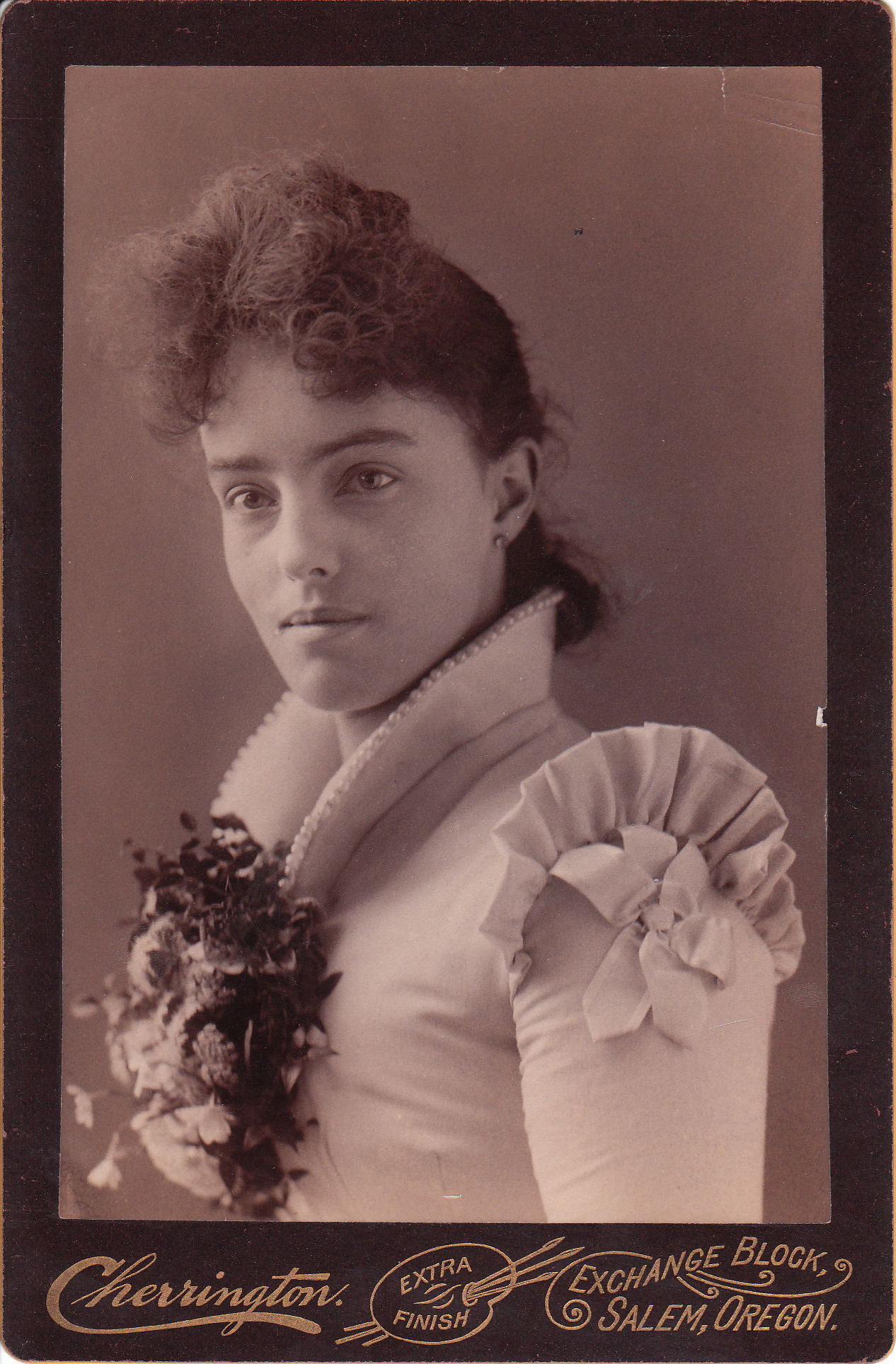 This cabinet card features an adorable little girl in a lace dress posed next to her pug dog. The child has beautiful eyes and curly hair. the photographer is Cherrington & Bro. of Salem, Oregon. The back stamp indicates that the studio was located opposite the First National Bank on the Exchange Block (Commercial Street). An inscription on the reverse of the card states that the photograph was given to Aunt Alice, “Compliments of Althea Hodson (or Hodsen)”. The inscription also states that the baby was 16 months of age at the time of the photograph. Research reveals that W. M. Cherrington came to Oregon in 1890 and with his brother, opened a photographic studio. The studio was considered to be the best equipped studio on the west coast. A large collection of their negatives were sold to the Cronise Studio. To view other photographs by Mr Cherrington, click on the category “Photographer: Cherrington”.