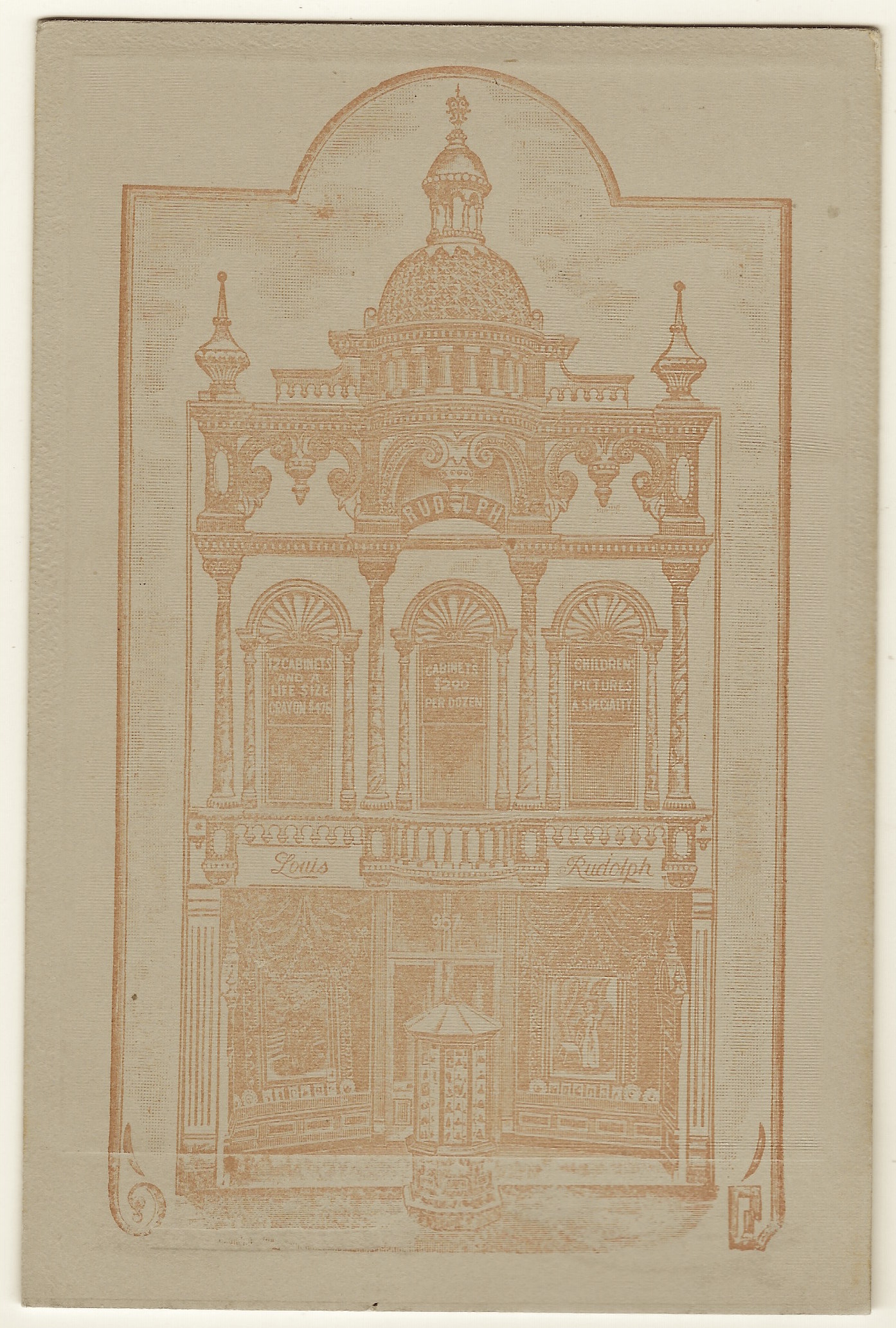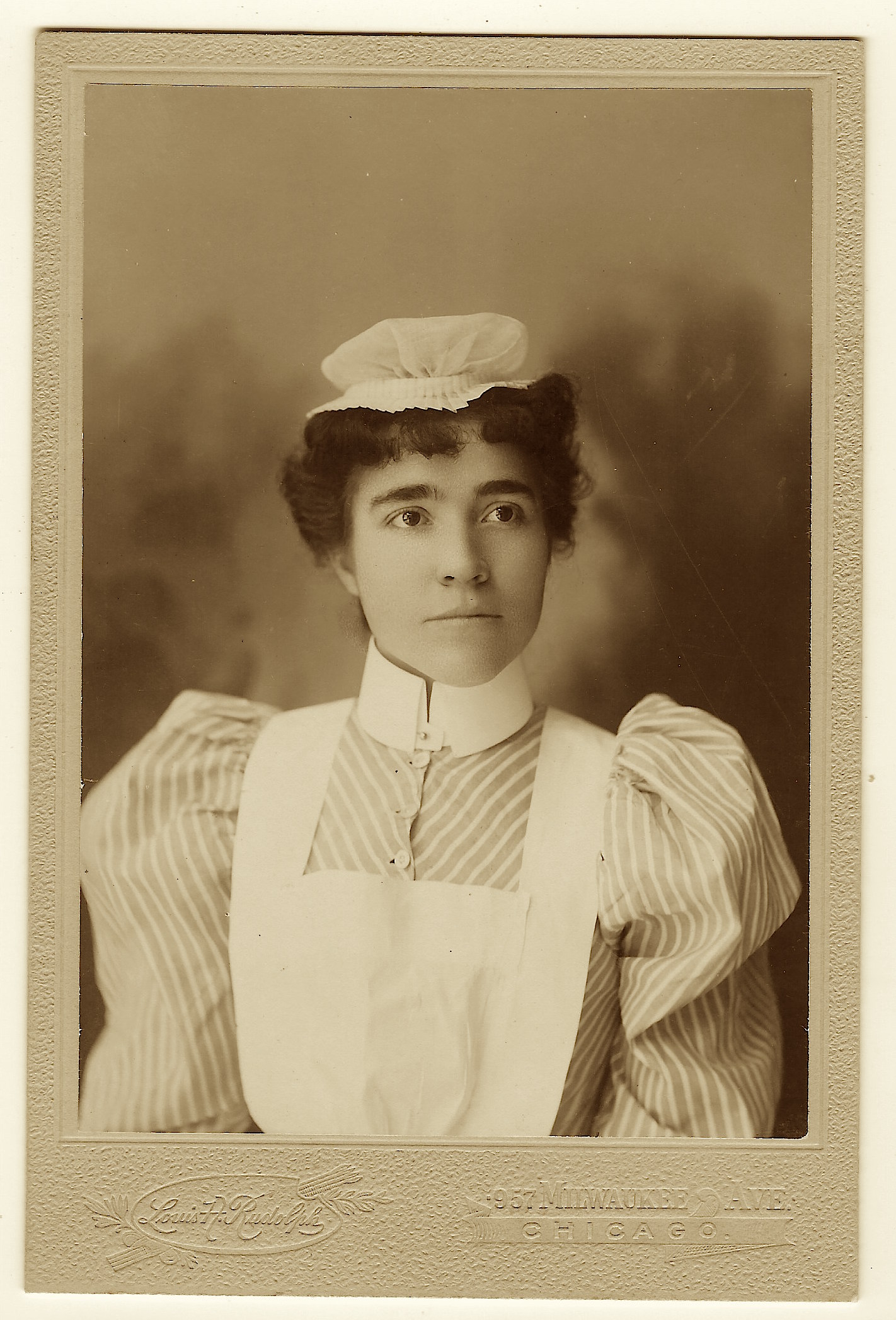 This cabinet card photograph features a portrait of a very pretty young nurse, or maid. She clearly is clearly is wearing a uniform. She seems very serious as she poses for her photograph at the Louis H. Rudolph studio in Chicago, Illinois. She has a wide-eyed expression and seems very attentive to the photographer. A drawing of the photographer’s studio (street view) can be seen on the reverse of the photograph. A sign in the window of the drawn building indicates that, at the time, cabinet cards sold for two dollar per dozen photographs. A listing of Chicago’s early photographers reports that Rudolph operated a studio between 1892 and 1900. He was born in 1871 and married Henrietta S. C. Ziehn in 1895. (SOLD)