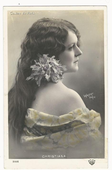 This is an opportunity to meet Christiana. One unsourced writer asserts that she was a Brazilian stage star. I was unable to confirm that assertion. However, I can confirm that Christiana was quite beautiful. This vintage real photo postcard features a profile view of the stage star. She is dressed in a pretty flower patterned dress and is wearing flowers in her long flowing hair. Senorita Christiana’s portrait is by the Walery Studio which was located in Paris, France. The hand tinted postcard was published by the Parisian firm “ELD” (E. Le Delay) and was part of a series (no. 2002). The postcard advertises the Casino de Paris which was one of the better known music halls in Paris. Christiana clearly performed there. Lucien Walery was a celebrated Paris photographer known for his portraits of artists and cabaret dancers from the city’s music halls. He is very well known for his portraits of Mata Hari and Josephine Baker. Walery did a lot of work in the genre of nude/erotic photography. He photographed the beautiful women of Paris between the early 1900’s and the 1920’s. You can view other images by this talented photographer by clicking on the category “Photographer: Walery”.