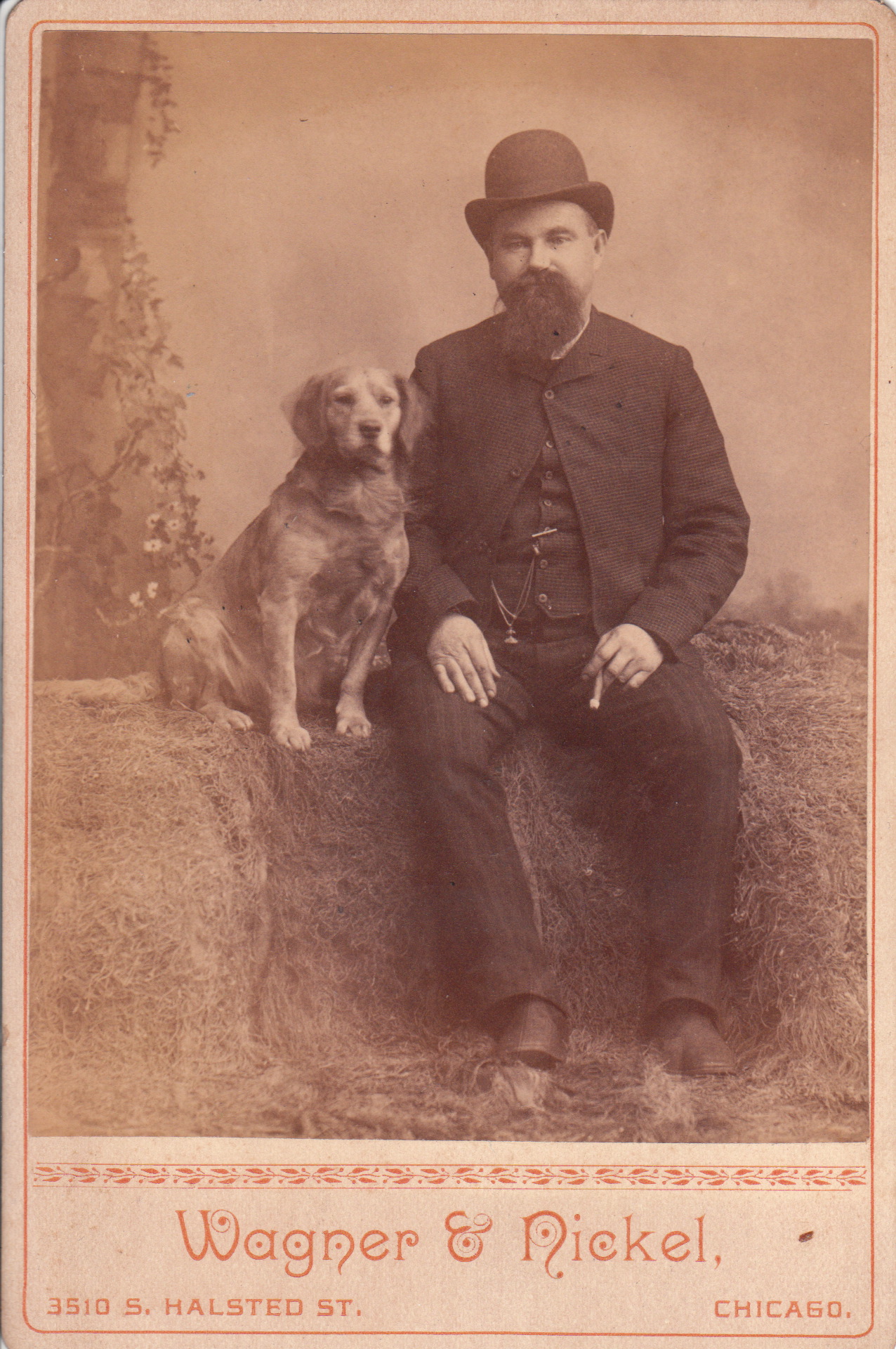 A well dressed man wearing a derby hat poses with his dog at the Chicago photography studio of Wagner & Nickel. The gentleman looks quite content sitting beside his “best friend” and enjoying his cigar. His canine companion appears to be a young Golden Retriever. The subject has a thick beard without sideburns.