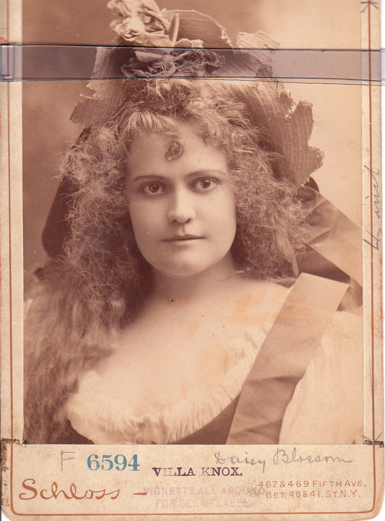 This cabinet card has a lot to say. First, the photograph features an actress named Villa Knox. She appeared in productions in the United States, England, and probably a number of other places. She acted in at least two Broadway shows. She appeared in the musical comedy “Boccaccio” (1898) and in “Apollo, or, The Oracle of Delphi” (1891). Second, the photographer of this image is the well known celebrity photographer, Jacob Schloss. At the time that this photograph was taken, the Schloss studio was located at 467 and 469 Fifth Avenue, between 40th and 41st Streets in New York City.. To view more of his photographs click on the category “Photographer: Schloss”. A third aspect of this photograph is that it has the pencilled name “Daisy Blossom” on the front of the card. Thanks to a little luck in my research, I learned that “Daisy Blossom” is a character in a play called “London Day by Day” (1893) which was reviewed by The Sydney Mail. This portrait likely captures Miss Knox in costume for that role. The fourth interesting fact about this image is the stamp appearing on the front of the card that states “Vignettes All Around For Segar Label”. It appears that this photograph was used as a vignette photograph for a cigar box label. The last feature I will mention concerning this image is that it has all the signs of once residing in someones photograph album. The cabinet card truly tells a number of stories and is in good condition. SOLD