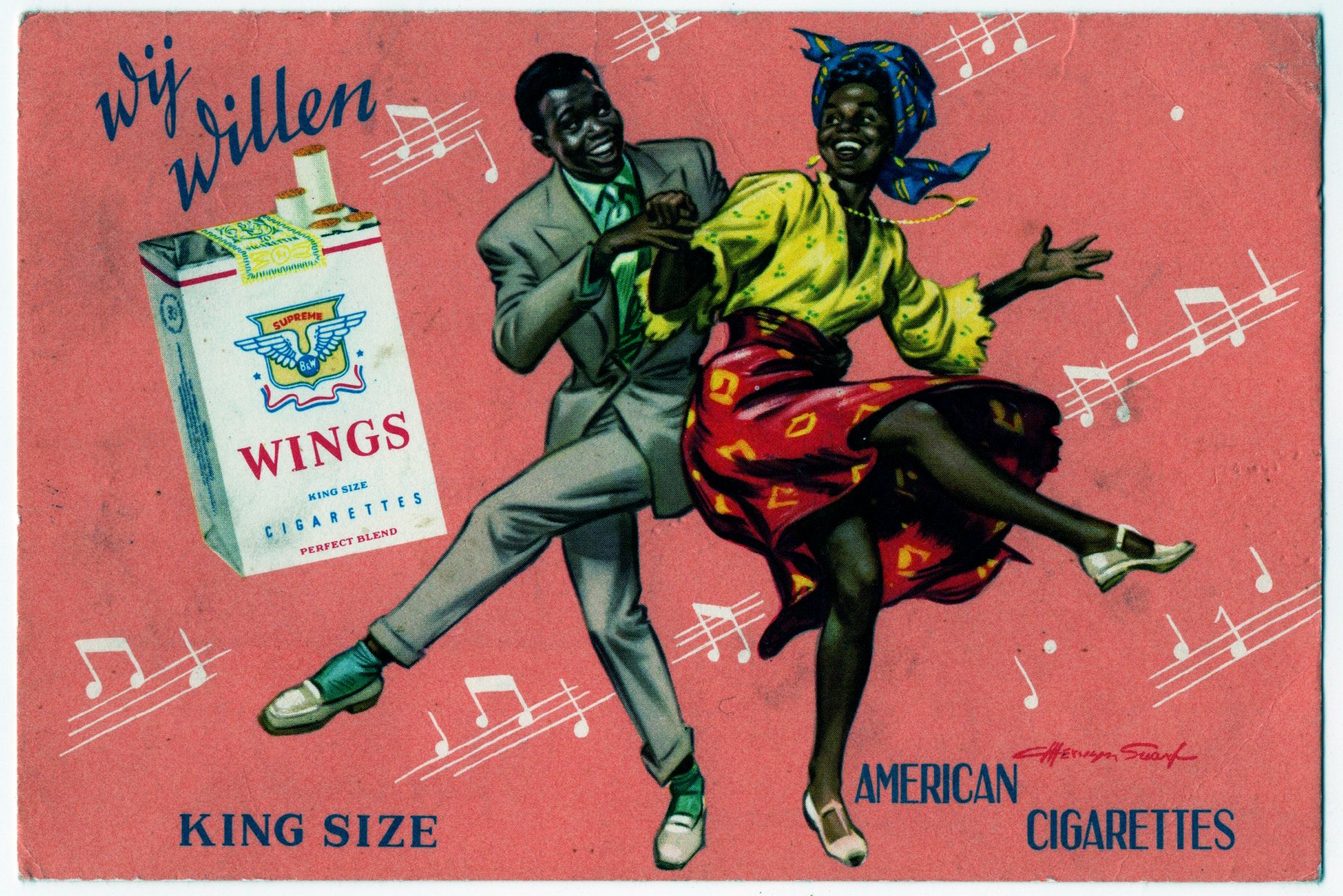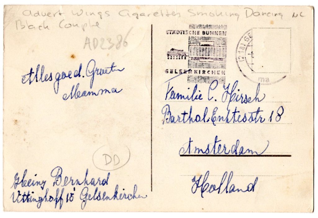 This striking uncommon vintage postcard advertises Wings Cigarettes, a brand first launched in 1929 by Brown & Williamson as a budget cigarette during the Depression era. On the front, the colorful lithograph illustration shows a joyous Black couple caught mid-dance, their movements surrounded by floating musical notes. The man, dressed sharply in a gray suit, steps forward with energy while his partner, in a bright yellow blouse, patterned skirt, and blue headscarf, matches him with exuberant motion. To the left of the scene is a large pack of Wings King Size Cigarettes, with the phrase “American Cigarettes — Perfect Blend” beneath. At the top left corner, the text reads “Wij Willen”, Dutch for “We want”, suggesting that this postcard was part of an overseas advertising campaign in the Netherlands or Belgium. The artist’s signature appears in red at the lower right; it is stylized and difficult to decipher. The reverse of the card deepens its international story. It is addressed to the Hirsch family in Amsterdam, Holland. The handwritten note is brief and in Dutch. The message translates to “Everything good. Greetings, Meanna.” Also printed text on the back includes the translated words “Municipal Theaters of Gelsenkirchen”, showing a German connection as well. The combination of Dutch and German references makes it clear this was not produced for the American market but rather intended as a European advertising piece. The card likely dates from the 1930s to the 1950s, a period when Wings was promoted both in the United States and abroad. During this era, the brand was widely known for its affordability—ten cents a pack—and later for its collectible airplane trading cards inserted into cigarette packs, which were especially popular in the early 1940s. The “King Size” emphasis seen here fits with mid-century branding, when longer cigarettes were marketed heavily. This postcard in Continental size (6 x 4 inches). (SOLD)