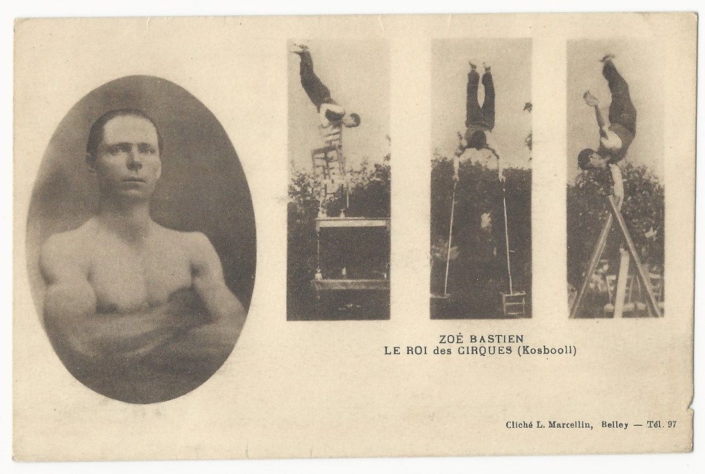 This vintage real photo postcard is an advertisement for a circus. Translated, the title states Zoe Bastien: King of the Circus. I do not know if “Zoe Bastien” is the name of the circus or if it is the name of the pictured acrobat. I am guessing that it is the name of the acrobat but I can not find confirmation. The photographs seen on this postcard were taken by L Marcellin. He operated a studio in Belley, a community in eastern France. The postcard has a tiny chip on the bottom right edge portion of the card. SOLD