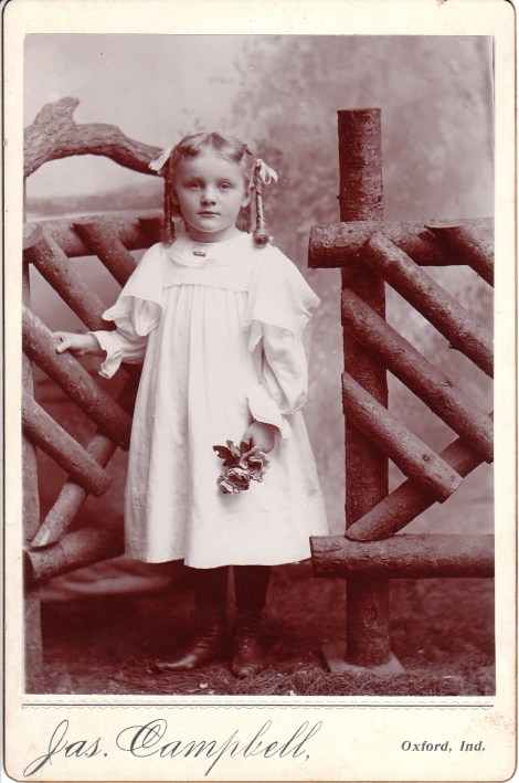 An adorable young girl poses by a wooden gate for photographer James Campbell in Oxford, Indiana. The little girl has terrific curls tied by bows and is holding flowers. The photographer of this cabinet card was a civil war veteran. The New History of the Ninety Ninth Indiana Infantry (1900) gives a brief biographical sketch of Campbell along with his photograph. James D. Campbell was born in 1845 in Fayette County, Indiana. He and his parents moved to Oxford in 1854. He was a well respected soldier in the civil war. He was a member of the 99th Indiana Infantry (Company C). He entered and left his regiment as a private. The book reports “He was one of those quiet faithful soldiers; always ready and always willing to do his duty”. His biography also describes him as married but having no children.