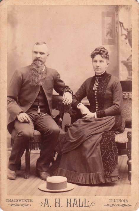 This cabinet card features a couple posing for their portrait at the studio of A. H. Hall in Chatsworth, Illinois. The gentleman has an interesting long and narrow beard, The woman has a dress with many buttons and is wearing a pin on her collar. Note the mans hat is on the floor directly in front of where the couple is sitting. It is not uncommon to see cabinet card portraits that include hats prominently displayed on the floor. Perhaps the hats were viewed as important enough to belong in the picture but it was considered inappropriate to wear hats indoors. The couple in this photograph are identified on the reverse as Joseph and Ella Francis. Investigation reveals that Joseph Francis served in the civil war. In 1864 he enlisted as a private in Company D of the Illinois 45th Infantry Regiment.He mustered out as a private in 1865. The 1880 US census identifies Joseph S. Francis (1846-1930) as a farmer of Irish descent living in Illinois. The 1910 census finds the Ohio born, Francis living in Forrest, Illinois and working as a railroad car inspector. He was 64 years old at the time and living with his wife Ella Svedaker Williamson Francis (1862-1938) and four of their children. The 1930 census that Joseph Francis, at age 84, was still employed. He was working as an assessor for his township. Research found death certificates for both Joseph (1930) and Ella (1938). The photographer of this image was Albert H. Hall. The History of Livingston County (1878) provides a brief biography of Hall. He was born in 1849 and at age 22 went to Chicago to learn the trade of photography. In 1872 he moved to Chartsworth and opened a photography and gem gallery. He married a woman named Dora Knapp.