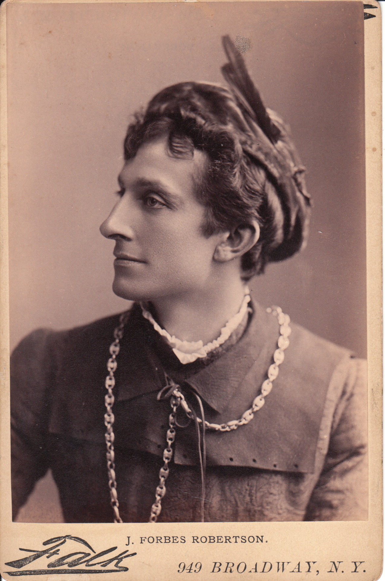 ROBERTSONJohnston Forbes-Robertson (1853-1937) was a celebrated English actor and theater manager. He was considered to be one of the finest actors of his time. He was particularly noted for his portrayal of Hamlet. He did not profess a passion for his acting profession. He was born in London. His father was a journalist and theater critic. He had ten siblings and four of them pursued acting. His original interest was to become an artist, but to support himself financially he entered acting. He worked with Sir Henry Irving for some time as a second lead actor. He then became a lead actor. His starring roles included Dan’l Druce, Blacksmith and The Parvenu (1882). George Bernard Shaw wrote the part of Caesar for him in Caesar and Cleopatra. Forbes Robertson acted in a number of Shakespeare plays and also appeared a number of times with actress Mary Anderson in the 1880’s. In 1900 he married the American actress, Gertrude Elliott (1874-1950). In 1930, Forbes Robertson was knighted. This cabinet card portrait was produced by photographer Benjamin Falk who’s studio was located in New York City. Forbes Robertson is captured in costume in this image. The reverse of the photo is stamped “J. M. Russell 126 Tremont Street, Boston”.