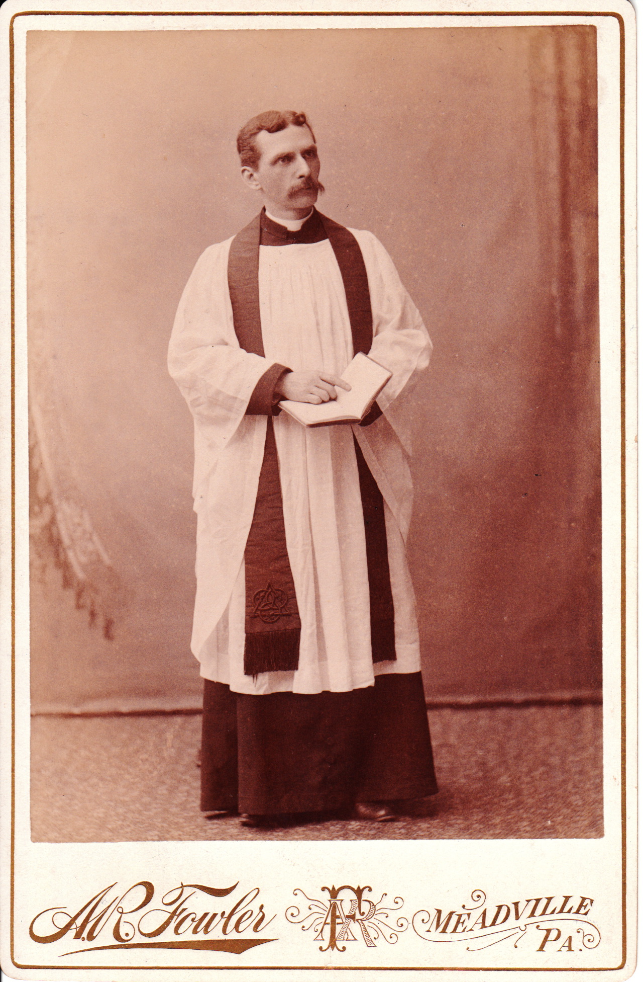 A minister, wearing his clerical robes and holding a prayer book, poses for his portrait at the A. R. Fowler studio in Meadville, Pennsylvania. The clergyman displays quite a stern appearance in this image. His congregation must have heard some fire and brimstone sermons from this cleric. To view other photographs by A. R. Fowler, and to learn more about him, click on the category “Photographer Fowler (A. R.).