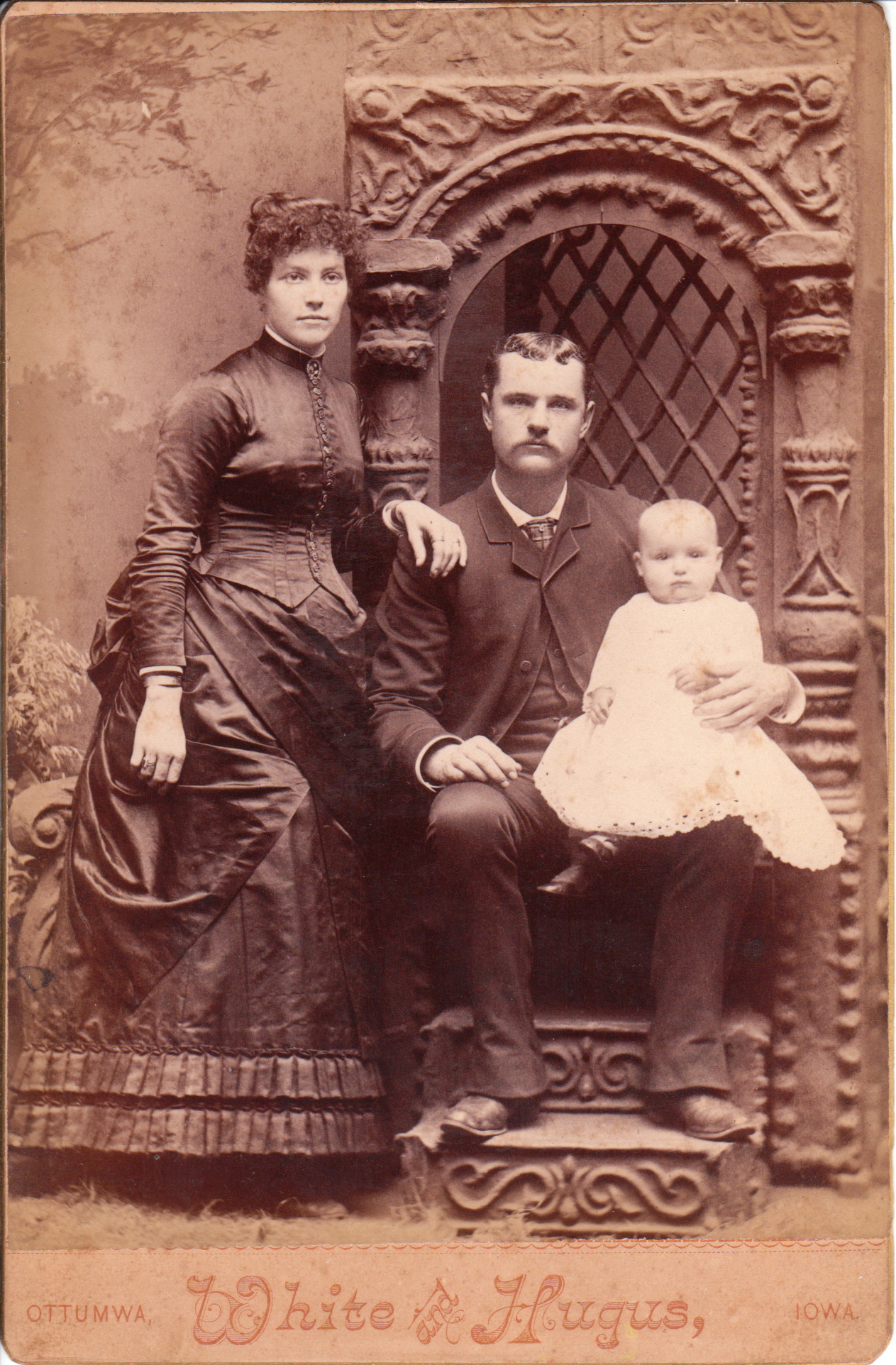 A young couple poses with their baby at the studio of White and Hugus in Ottumwa, Iowa. The couple are well dressed and the family is nicely posed for their portrait. The husband is sitting on an interesting and ornate seat (prop). The woman has her hand affectionately placed on her husband’s shoulder and the husband keeps a careful hold on the couple’s extremely alert baby. No information about the photographers was found in preliminary research. The town of Ottumwa is in southeast Iowa. It was a coal mining town. The state mine inspector reported that there were 15 mine shafts in the town in 1889. From 1890 through 1892 an exhibition center was built in the town. It was called the Coal Palace. Perhaps the gentleman in this photograph was associated with the mining industry.