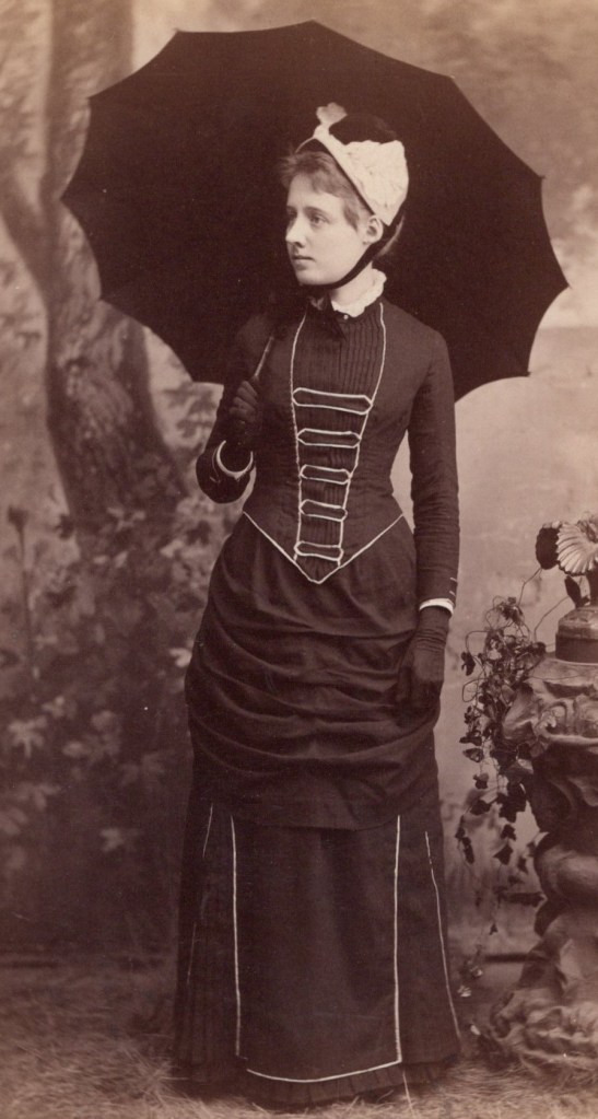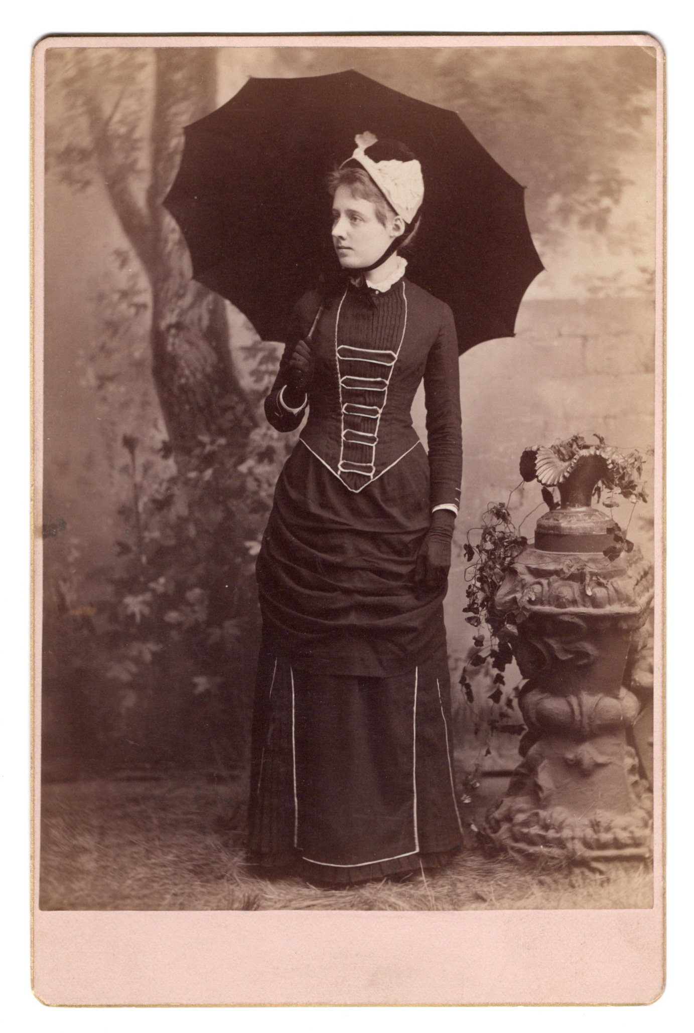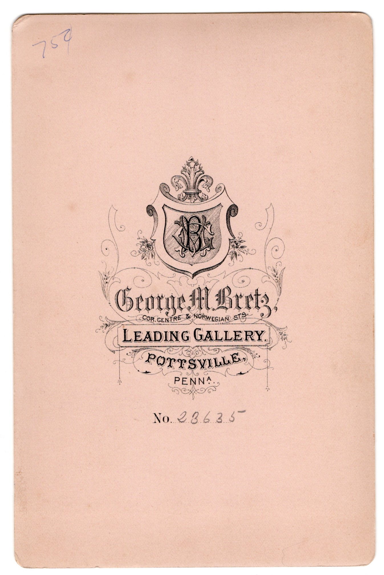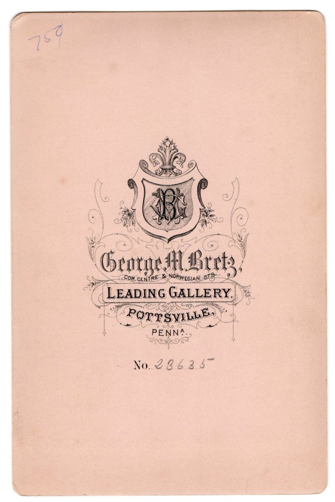 A pretty young lady poses for her portrait at the George M. Bretz gallery in Pottsville, Pennsylvania.The woman has a serious facial expression. She is beautifully dressed. She is wearing a dark dress, dark gloves, and is holding an umbrella. She is certainly a fashionista. Her dark manner of dress may indicate that she is wearing a mourning dress. George M. Bretz (1842-1895) is a well known and acclaimed American photographer. He is best known for his photographs of the Northeastern Pennsylvania Coal region as well as for his portraits of coal miners. This cabinet card is in very good condition (see scans). The Smithsonian’s National Museum of American History and the University of Maryland both have collections of his photographs. His images were displayed at the World Expositions of 1884 and 1993. Bretz built the reputation of his being an authority about coal mining. Many articles about his photography were published. SOLD