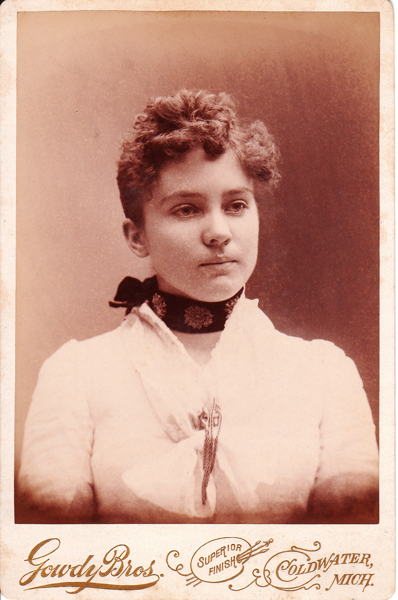 A pretty woman poses for her portrait at the Gowdy Brothers Art Studio. The studio was located at 22 Chicago Street in Coldwater, Michigan. The subject of this photograph looks to be quite serious. Note the woman’s neckerchief. One of the Gowdy brothers is likely Albert G. Gowdy and a 1900 publication reports that the Gowdy Brothers studio was established in Coldwater in 1888 and that the studio was known nationally for its work producing photographic buttons and medallions.