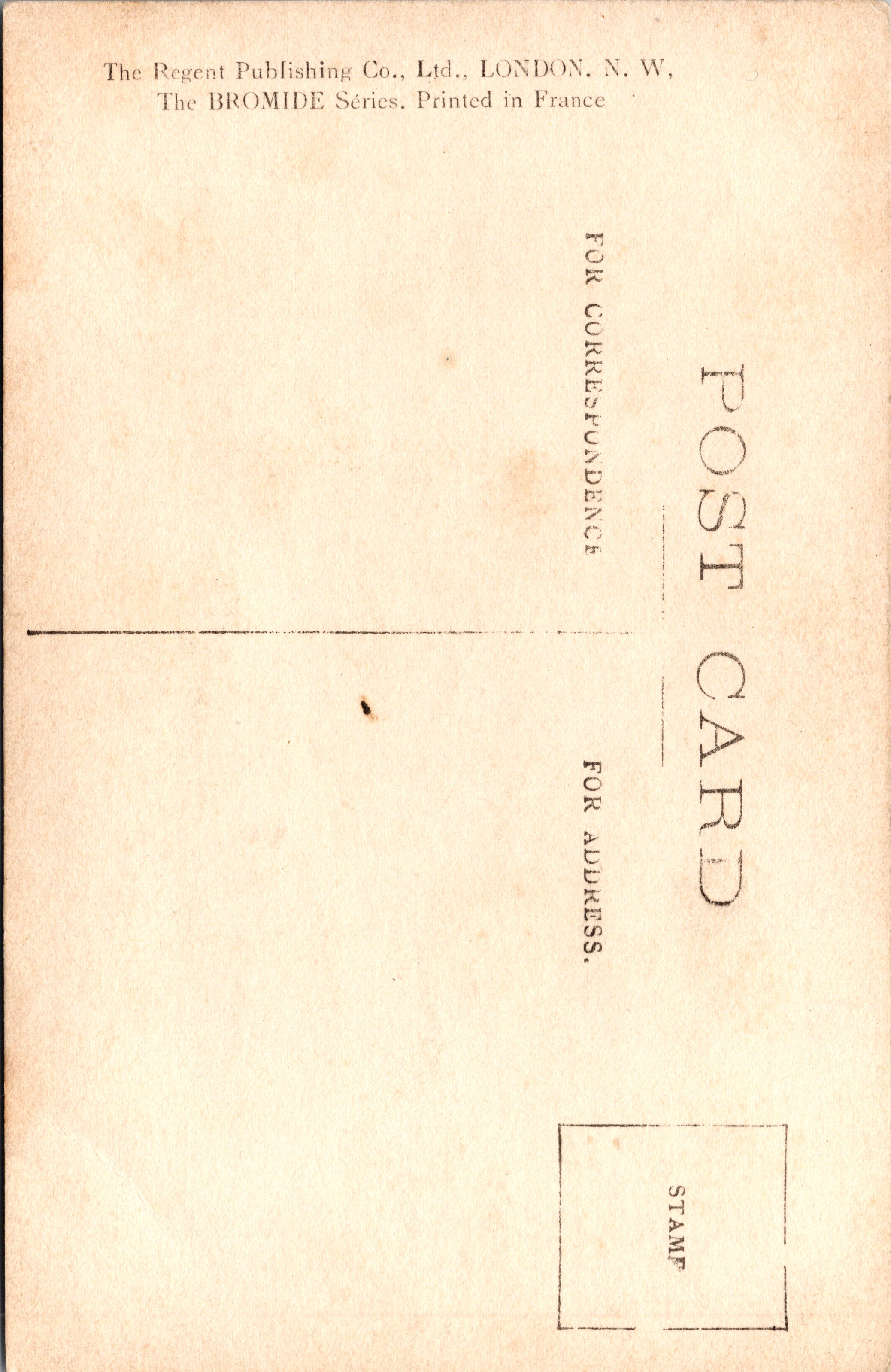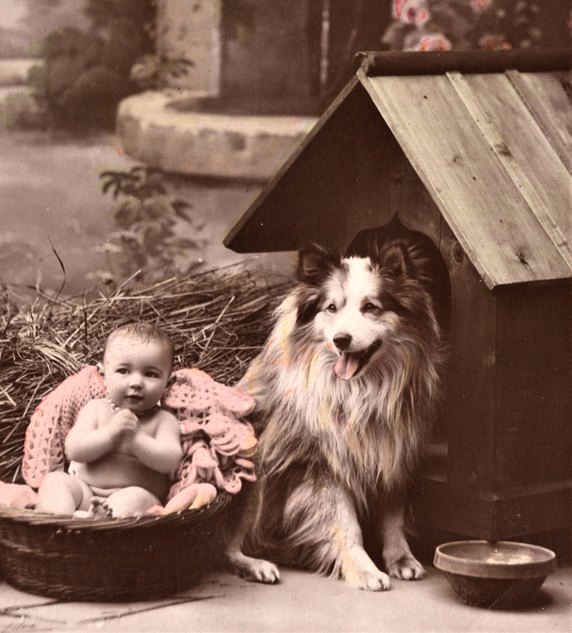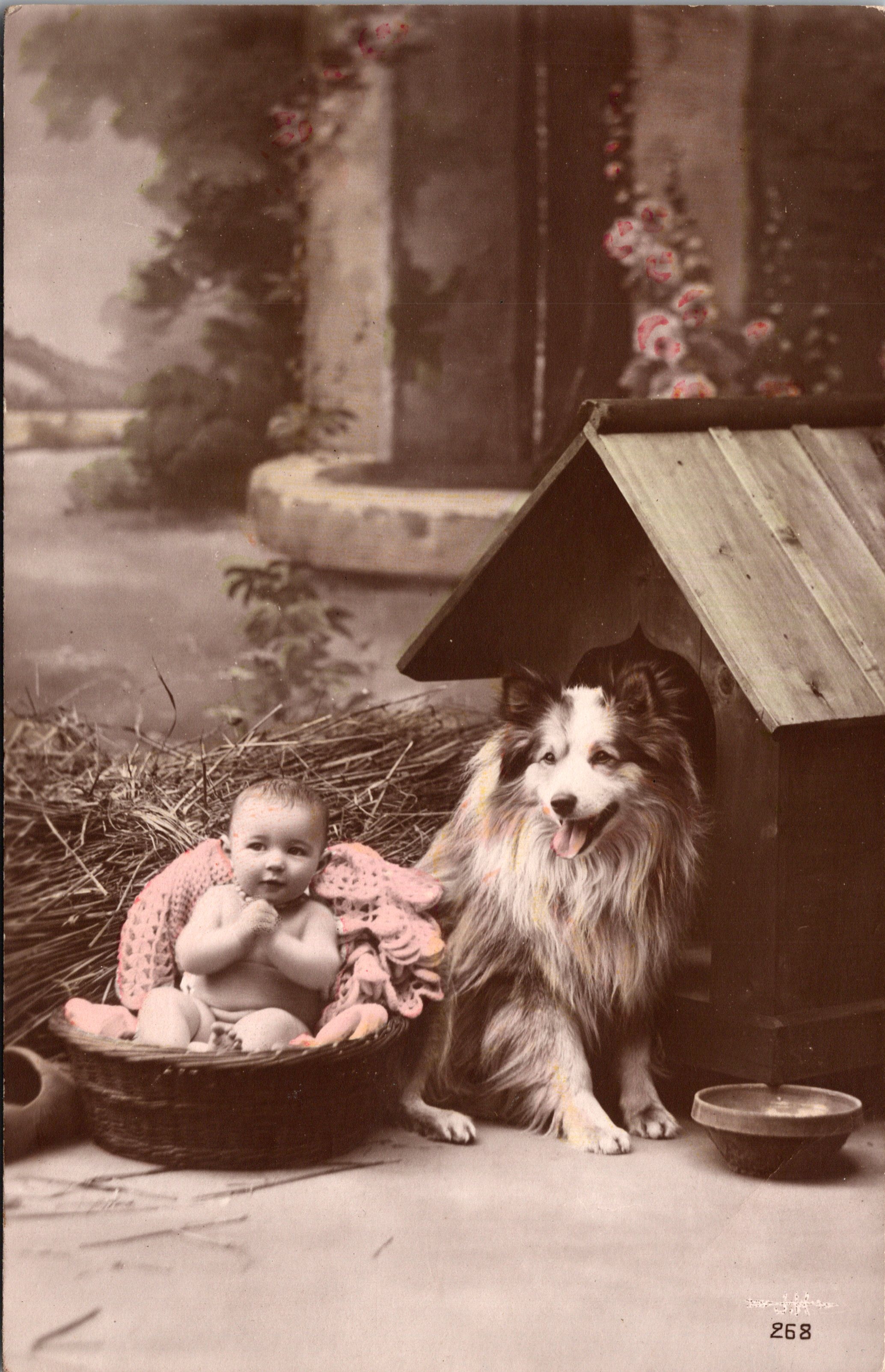 This vintage real photo postcard features a darling photograph of a baby on a blanket in a basket. Sitting beside the child, is a beautiful collie (or border collie). Note the wooden doghouse and the dog’s water bowl. The postcard was published by the Regent Publishing company as part of the “Bromide” series. The firm was located in London, England. The postcard is color tinted. The card was printed in France. The postcard dates back to the 1900’s. This postcard is in very good condition (see scans).