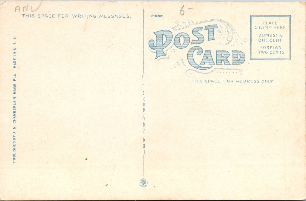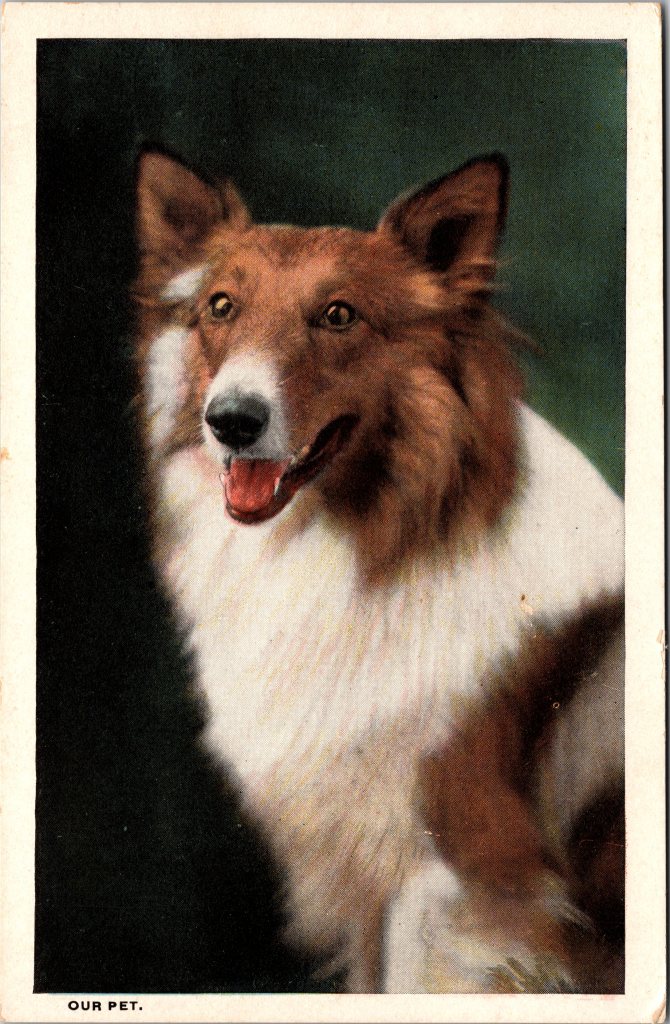 This vintage postcard features a beautiful collie. The dog has a wonderful expression. It appears that the collie is smiling. The caption on the card states “Our Pet”. The postcard was published by J. N. Chamberlain. The firm was located in Miami, Florida. The printer of this card was C. T. American Art. This company was a leading postcard publisher and printer. They operated between 1898 and 1978. The company was founded by Curt Teich (1877-1974) in 1898. It was headquartered in Chicago and known as the Curt Teich Company. (SOLD)