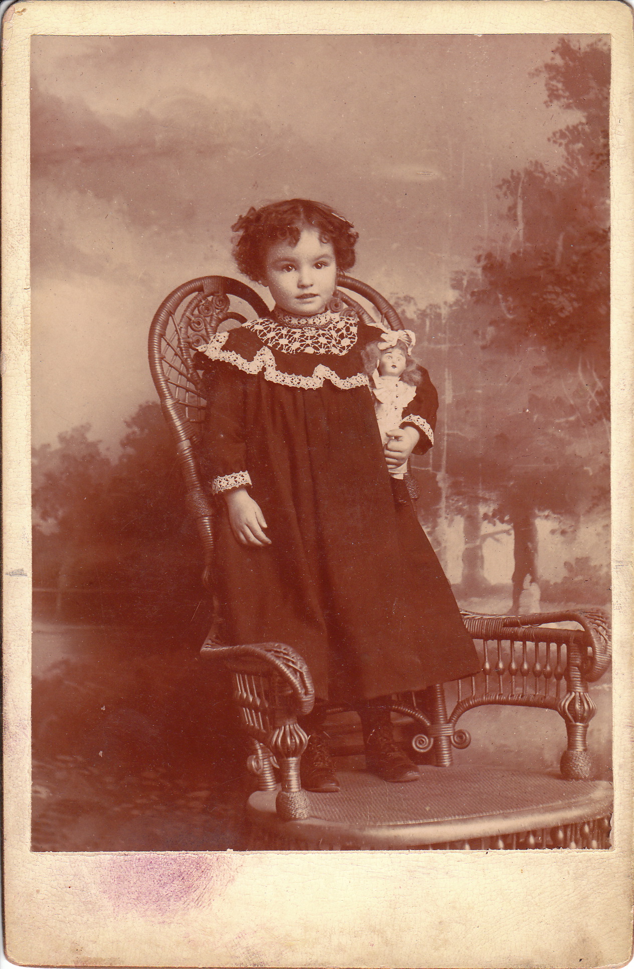 This cabinet card features a very cute, curly haired, little girl standing on a chair. She is clutching her doll and carefully posing the doll for the photograph. She is wearing an adorable dress. The fabric at her collar matches the fabric on the cuffs of her sleeves. The little girl is identified on the reverse of the card as “Mrs. J. J. Joseph”. A faded back stamp identifies the photographer as L. McLean, and his studio as being located in Idaho Springs, Colorado. Lachlan McLean was listed in the Clear Creek County Business Directory (1890). His work was well respected and a biography has been written about his life, Secure the Shadow: Lachlan McLean, Colorado Mining Photographer (1980). This cabinet photograph was taken only a few decades after the founding of Idaho Springs. The town was established by prospectors in the early days of the Pikes Peak Gold Rush. Idaho Springs was the site of the first significant gold discovery in Colorado. (SOLD)