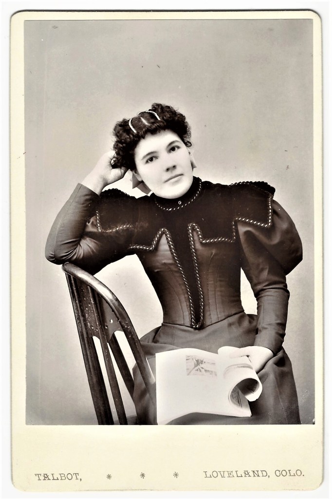 A pretty young woman sits sideways on a chair and holds an open magazine as she poses for her portrait at the Talbot studio in Loveland, Colorado. If she is indeed sitting sidesaddle on the chair; it is an unusual pose. She is wearing an interesting and uncommon dress. Perhaps a visitor to the cabinet card gallery can tell us something about the dress. What kind of material is this dress made from? What is the material of the fabric that is sewn over parts of the dress? What kind of hair accessory is she wearing atop her head? Note that she is also wearing a ribbon which can be partially seen behind her head. Are you wondering about the “Mammoth Potato Hoax” yet? I’ll get right to that intriguing story after a brief description of the town where the Talbot studio was located. In the early seventies (the nineteen, not the eighteen seventies) I used to ski Loveland’s slopes and mail valentine day cards from the Loveland post office. It was considered extra romantic to have a Loveland postmark on your Valentines Day cards. I enjoyed the town, but never knew the story of how Loveland got it’s name. Research reveals that Loveland was founded in 1877 and was named in honor of William A. H. Loveland, the President of the Colorado Central Railroad. Not many years later, Adam H. Talbot operated a photography studio in Loveland. In 1894, he was recognized nationally and internationally for his involvement in the “Mammoth Potato Hoax of Loveland, Colorado”. The hoax actually started very innocently. The editor of the Loveland Reporter wanted to help a local potato farmer, Joseph B. Swan, promote his spud sales at a Loveland street fair. The farmer was well respected for his potato production. He had grown 26,000 pounds of potatoes on one acre of land over a years period. He had claimed to have grown a giant potato weighing 13 lbs, 8 ozs. In an effort to create a humorous advertisement for farmer Swan, the newspaper editor recruited photographer Talbot to use trick photography to create a photograph of Swan holding a massive potato over his shoulder. Printing below the image stated that the potato weighed over 86 pounds. Unfortunately, or fortunately, depending on the participants point of view, many people believed that this attempt at humor was actually reality. Word spread about this amazing potato. Eventually, a New York City attorney sent the photograph to the editors of the Scientific American. The attorney included a note that stated that the actual potato had been on exhibit at the Loveland Reporter offices. The editors ordered an engraving of the photograph to be made and than published it as real news in an 1895 issue. Eventually, the editors became aware of the truth about the photograph and published an angry retraction. The magazine reported it was victim of a “gross fraud” and stated unkind opinions about photographer Talbot. They asserted that “An artist who lends himself to such methods of deception may be ranked as a thoroughbred knave, to be shunned by everybody”. The story of the “mammoth potato hoax” went viral, 1890’s style. It was widely reported but still many were not aware that the giant potato never existed. Farmer Swan was besieged by letters asking for information and offering to buy his amazing potato seeds. Swan would try to explain that the famous potato never existed, but people did not believe him. Eventually, Swan just told inquirers that the potato had been stolen. Incredibly, the story of the huge potato appeared in The Strand Magazine (1897), and it was reported as true news. After some years had passed, Talbot finally received some positive acclaim in the St. Louis and Canadian Photographer (1902). Talbot was recognized for producing photographs for a book named “Loveland, Colorado Illustrated”. SOLD