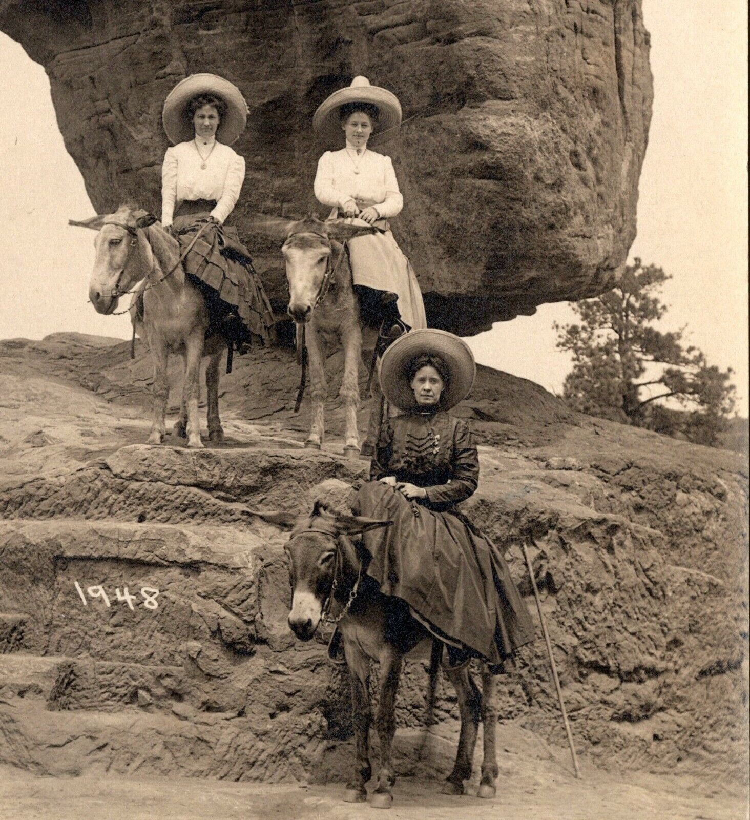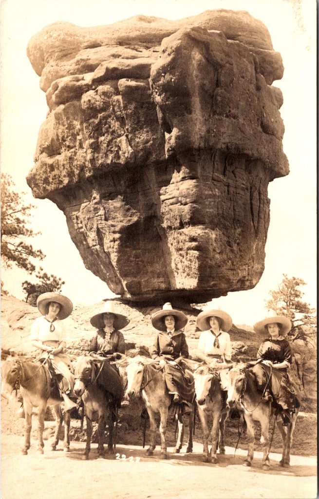 BALANCED ROCK : GARDEN OF THE GODS : COLORADO : WOMEN ON BURROS : RPPC 1920’s