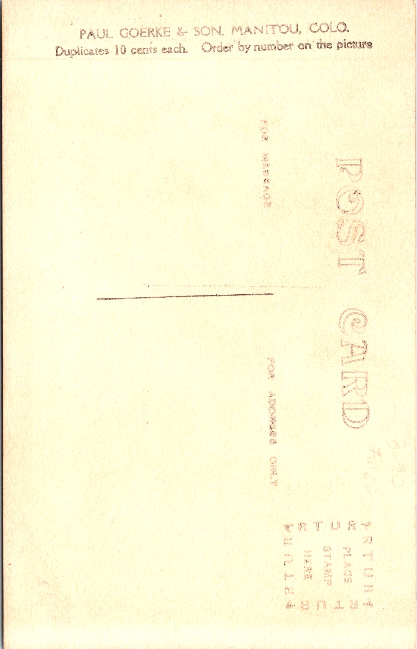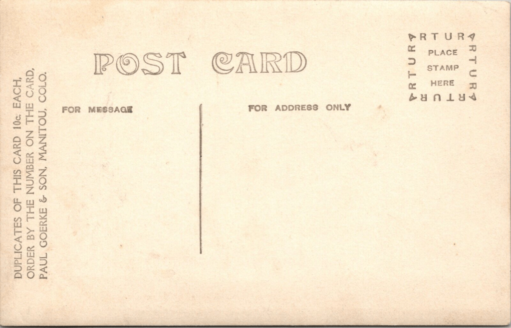This vintage real photo postcard features three women on riding burros, posing in front of Balanced Rock. The natural wonder is located within The Garden of the Gods. The photographer of this image is the Paul Goerke and Son studio, located in Manitou, Colorado. In the 1890’s, Goerke purchased the land around Balanced Rock. Goerke and his son, Curt, took photographs of tourists by the rock and sold them for 25 cents apiece. At the beginning of Goerke’s business there was no charge to view Balanced Rock. They made their money by charging for the portraits. Burros were among the props supplied by Goerke. This postcard has an Artura stamp box. The photo was taken sometime between 1908 and 1924. (SOLD)