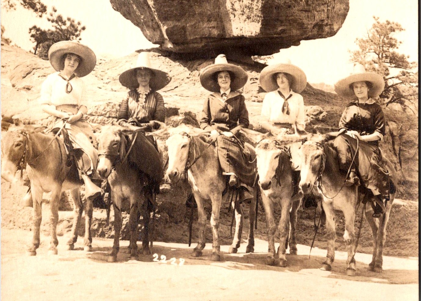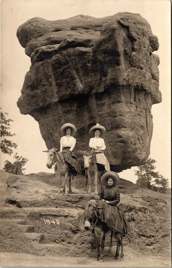 THREE WOMEN ON MULES: BALANCED ROCK : GARDEN OF THE GODS : MANITOU, COLORADO