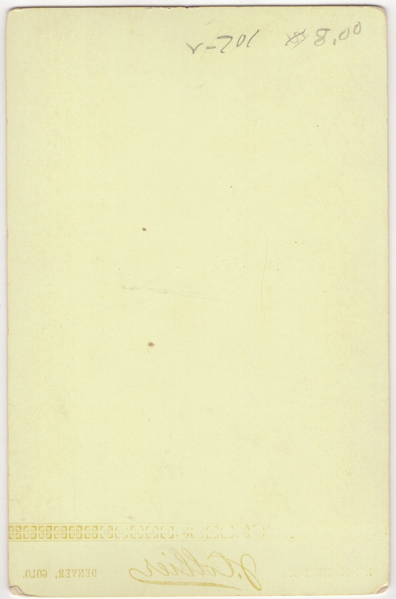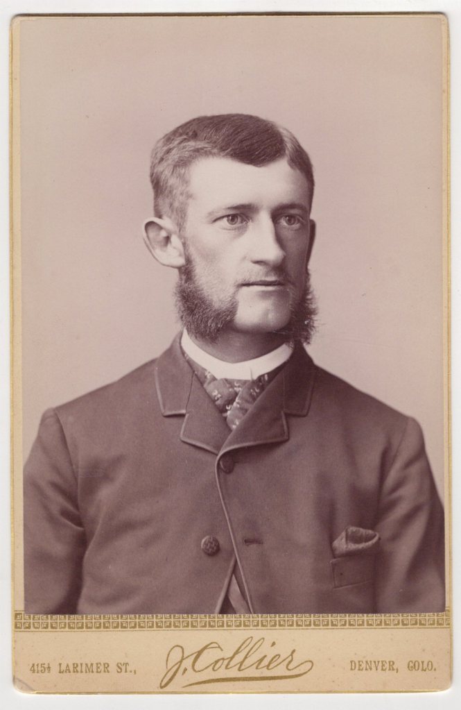 This cabinet card portrait features a handsome man with interesting styled side burns. He is dressed fashionably. The gentleman was photographed by a famous Colorado photographer, Joseph Collier (1836-1910), at his Denver studio. Collier was born in Scotland, where he began his career as a photographer. When he first came to Colorado, he produced stereographic images. He gained fame in the late 1800’s for his images of Colorado. His subjects included the downtowns of Telluride, Golden, and Denver. He also photographed the Garden of the Gods (Colorado Springs) and many mountain sites. After Collier immigrated to the United States, in 1871 he came to Central City Colorado. He was invited there by his cousin who owned the local newspaper. Collier opened his first studio in the backroom of the newspaper. He immediately began making photographic trips through the Rocky Mountains of Colorado. In 1873, Collier gave a set of his Colorado stereoviews to Julia Grant, the wife of President Ulysses Grant. In 1877, Collier moved to Denver opening a studio on Larimer Street. He practiced photograph there and retired by the turn of the century. In 1874, Collier provided the photographs for a book entitled “Summering in Colorado”. In addition, a book was published in 1983 focused on displaying Collier’s photos. The book was entitled “The Photography of Joseph Collier. Colorado. 1871-1910”. Some of Collier’s photos can be found at the Getty museum in Los Angeles, California.