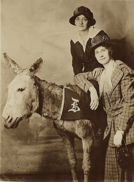 This vintage real photo postcard features two women posing with a stuffed donkey. The donkey is wearing a banner that says “Denver”. The photograph was taken by the Colotex studio which was located in Denver. My guess is that “Colotex” stands for “Colorado/Texas”. Perhaps the photographer had lived and/or worked in both states. I would also posit that the subjects in this photo are mother and daughter. The “AZO” stamp box indicates that this postcard was produced between 1904 and 1918. The postcard is in very good condition (see scans).