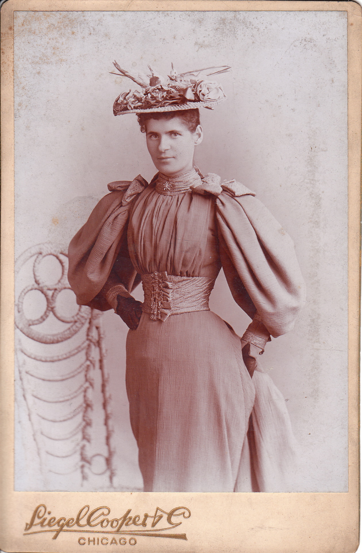 This cabinet card features a fashionable woman wearing an interesting, but not necessarily attractive hat. She is very thin waisted, thanks to a corset. The photographer is Siegel Cooper and Company of Chicago, Illinois. Siegel Cooper was a major department store in Chicago. Note the art work on the reverse of this cabinet card. Click on category “Photographer: Siegel Cooper” to see other photographs by this studio. (SOLD)