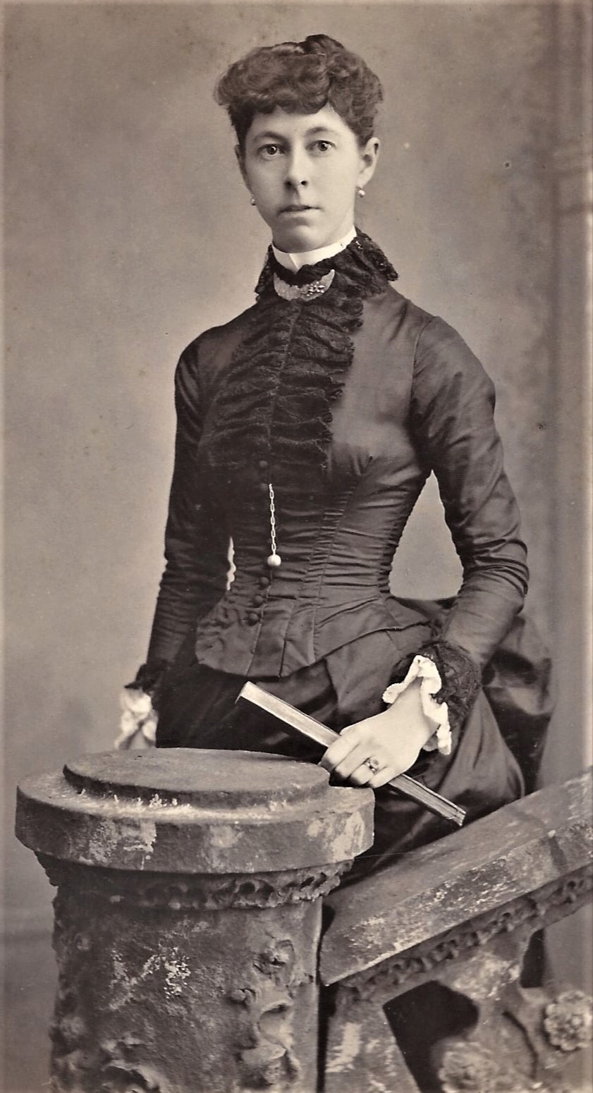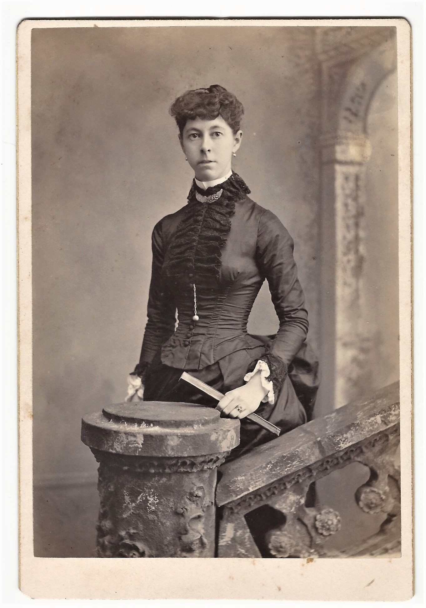 The young woman in this cabinet card portrait is tall, thin, and wearing a dark dress. She is very well dressed. The woman is tightly corseted, which is typical for the era of this photograph. She is holding a folded fan. This photograph was taken in Florence, Massachusetts at a gallery operated by Ferdinand William Schadee (1840-1901). Schadee was born in Bavaria, Germany. I found no record of when he arrived in the United States. In 1869, he married Eliza A Schadee and the couple eventually had at least three children. Schadee was a Mason. A publication entitled “The History of Florence, Mass.” (1895) reveals that Schadee established his gallery there in 1885. Prior to that time, he ran a studio in Northampton, Mass. That studio was operated under the name of “Hardie & Schadee”. The 1880 US Census lists Schadee as a photographer as does a number of editions of the Northampton and Easthampton directory. He was listed in the directory up to 1901, indicating that he was working as a photographer until his passing. (SOLD)